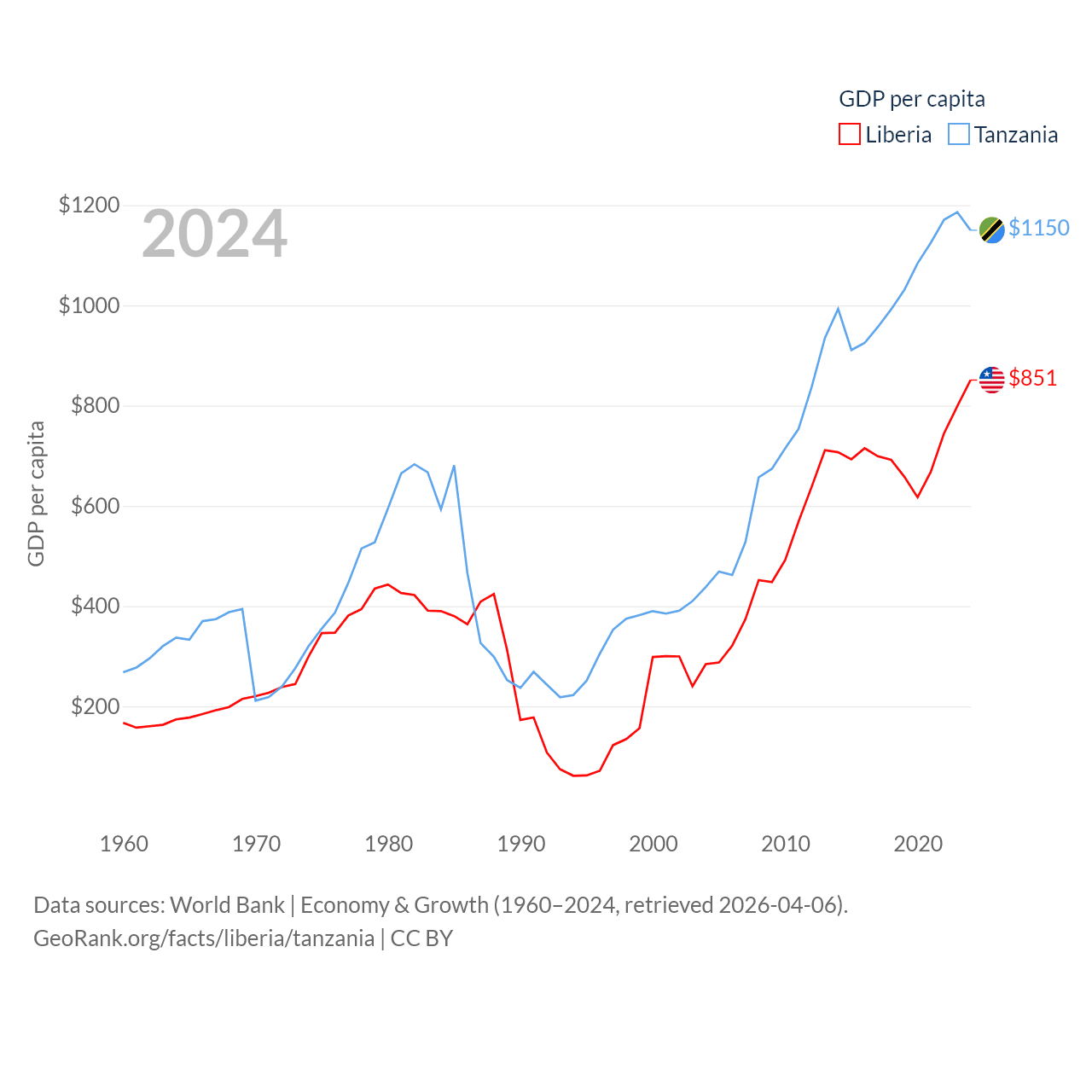 By GDP, Liberia ranks 163/197 ($4.78B) and Tanzania ranks 82/197 ($78.8B). By GDP per capita, Liberia ranks 184/197 ($851), while Tanzania ranks 170/197 ($1,150).