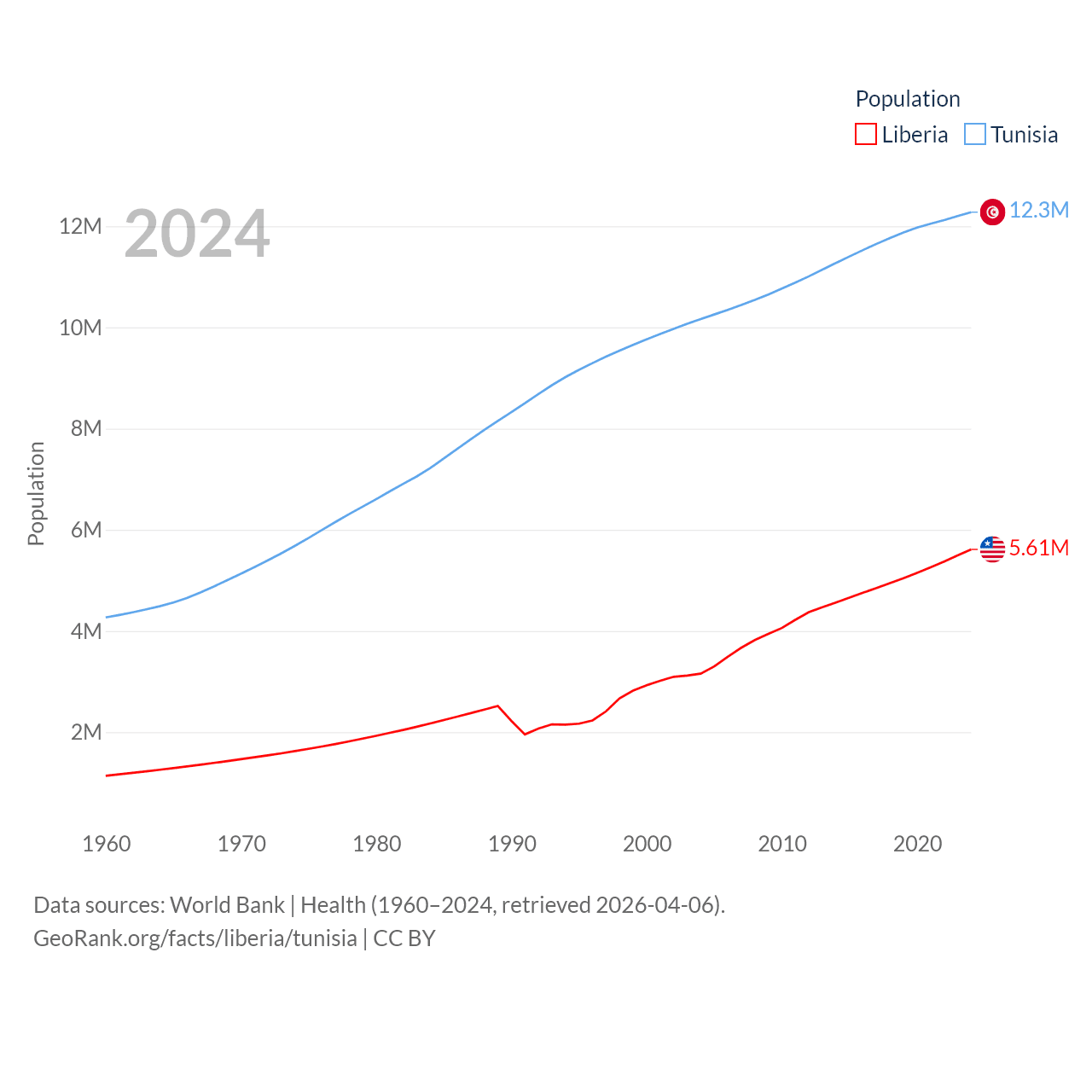 Liberia has a population of 5.61M (ranked 117/197), compared with 12.3M in Tunisia (ranked 80/197). Liberia's land area is 37,189 sq mi versus 59,985 sq mi for Tunisia (ranked 106th vs. 91st).