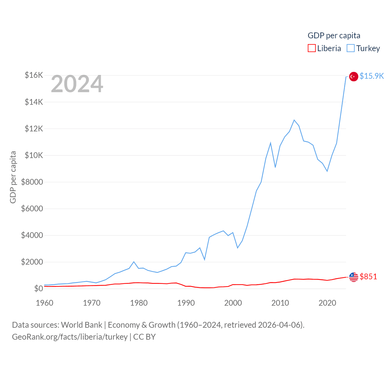 By GDP, Liberia ranks 163/197 ($4.78B) and Turkey ranks 17/197 ($1.36T). By GDP per capita, Liberia ranks 184/197 ($851), while Turkey ranks 66/197 ($15,893).