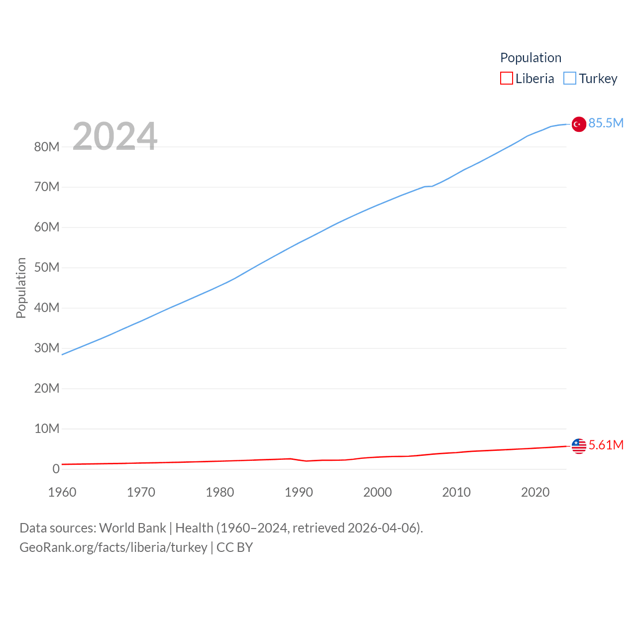 Liberia has a population of 5.61M (ranked 117/197), compared with 85.5M in Turkey (ranked 18/197). Liberia's land area is 37,189 sq mi versus 297,156 sq mi for Turkey (ranked 106th vs. 36th).