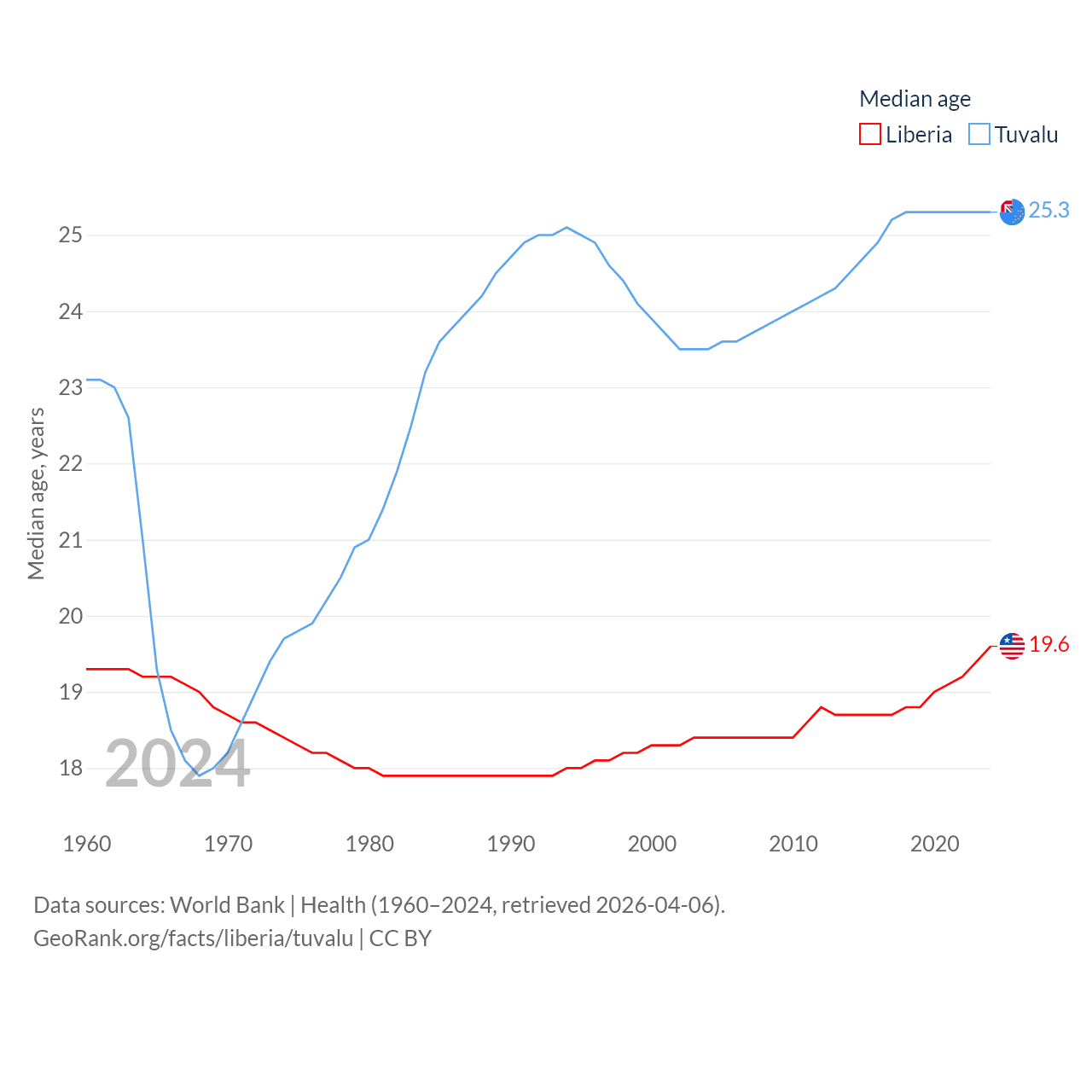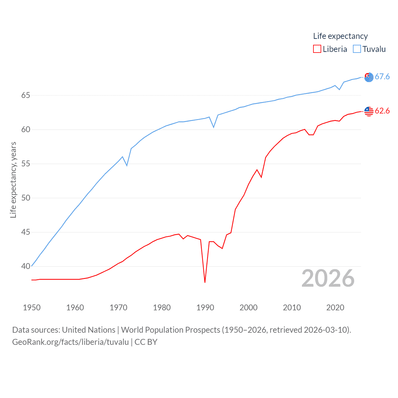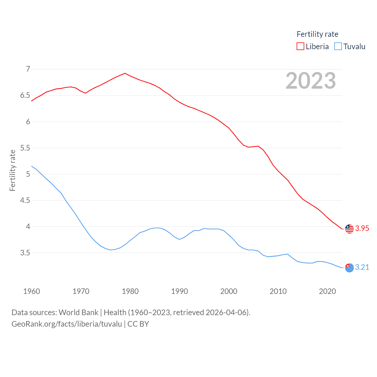 Liberia has a population of 5.61M (ranked 117/197), compared with 9.65K in Tuvalu (ranked 196/197). Liberia's land area is 37,189 sq mi versus 11.6 sq mi for Tuvalu (ranked 106th vs. 194th).