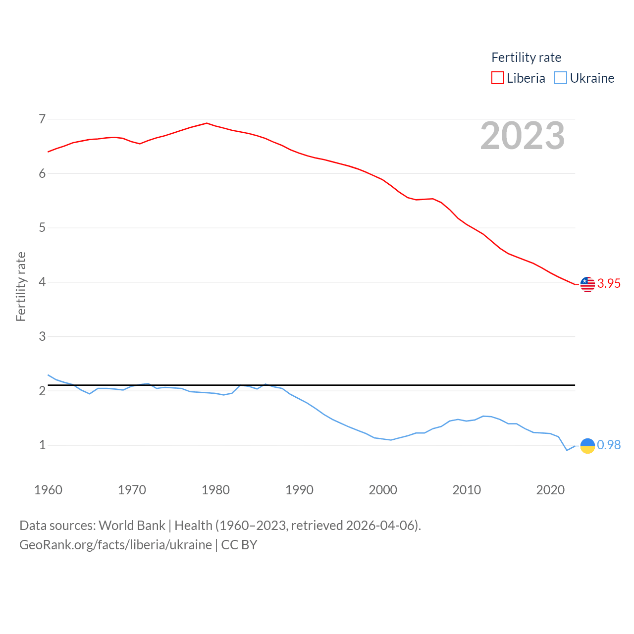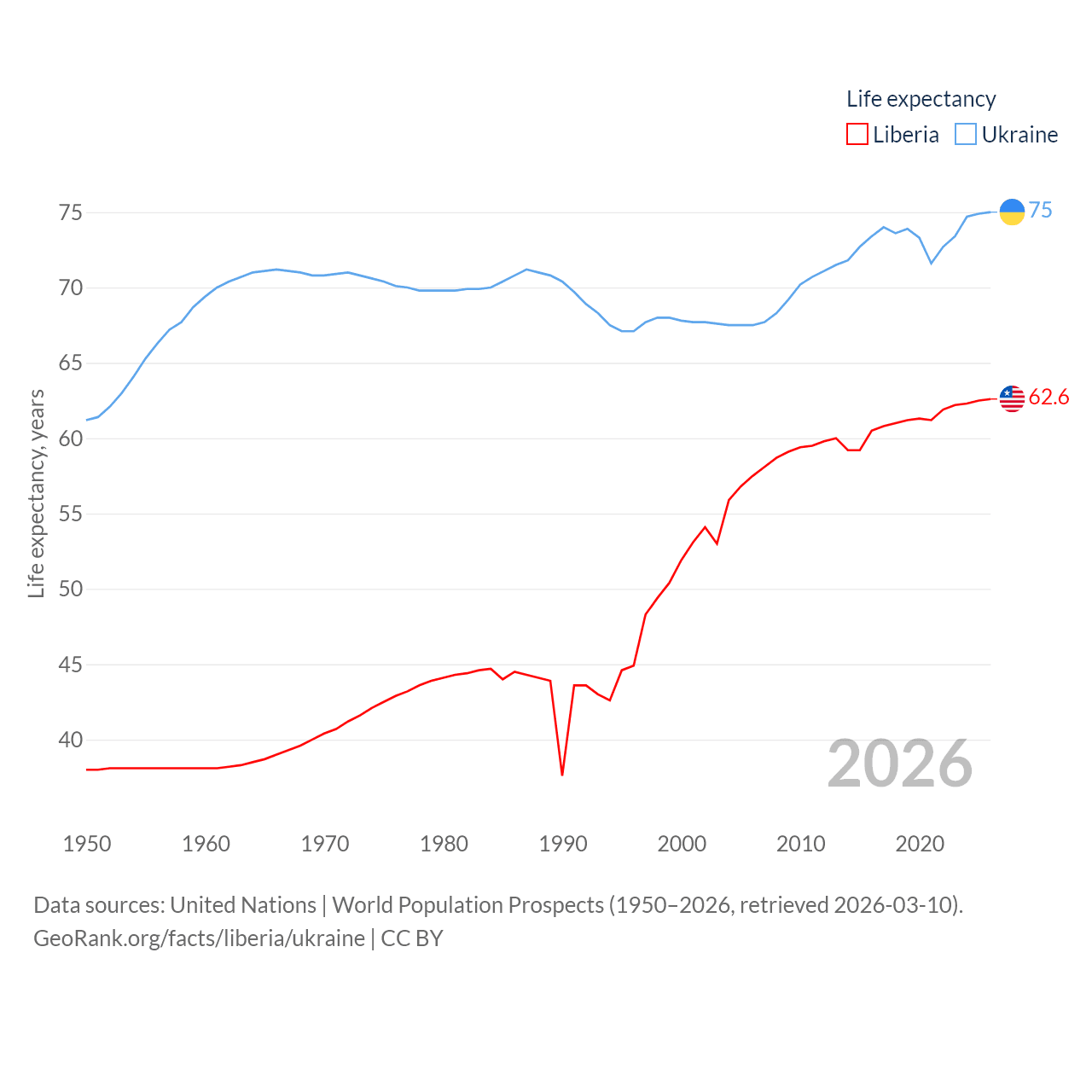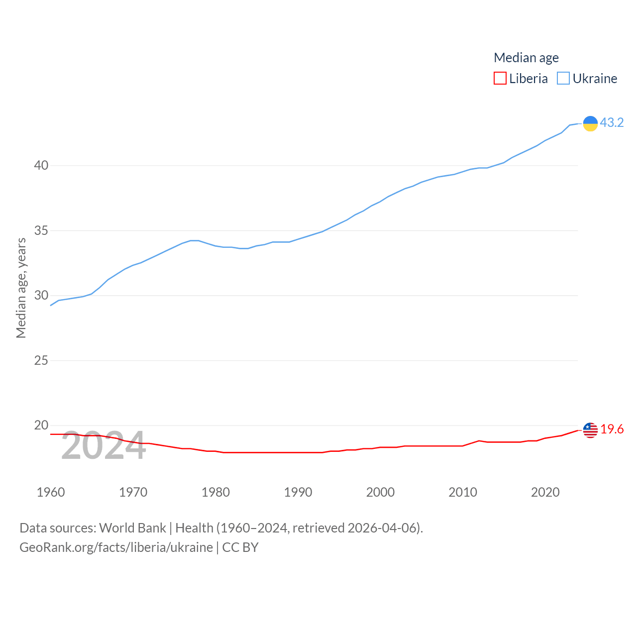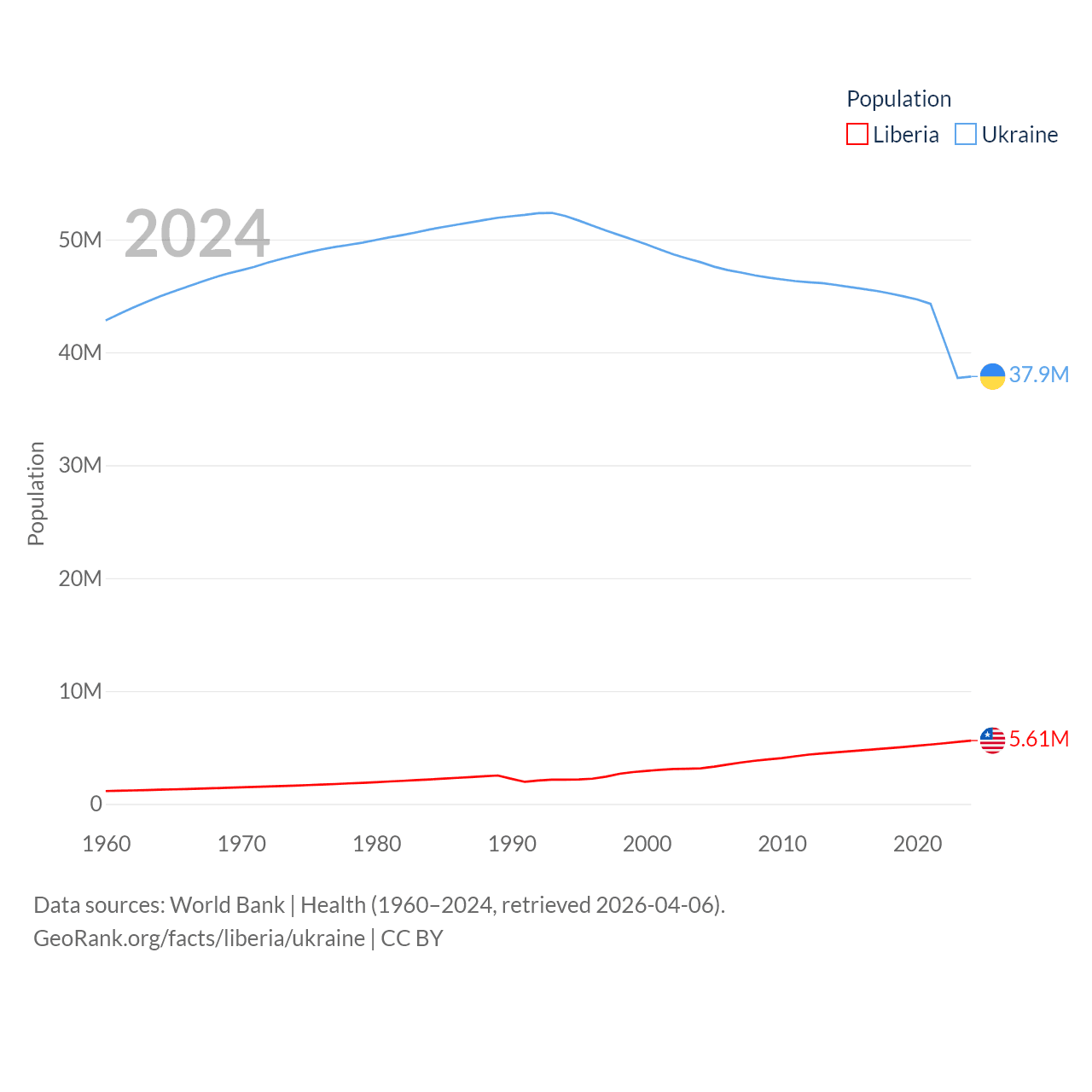 Liberia has a population of 5.61M (ranked 117/197), compared with 37.9M in Ukraine (ranked 41/197). Liberia's land area is 37,189 sq mi versus 223,708 sq mi for Ukraine (ranked 106th vs. 46th).