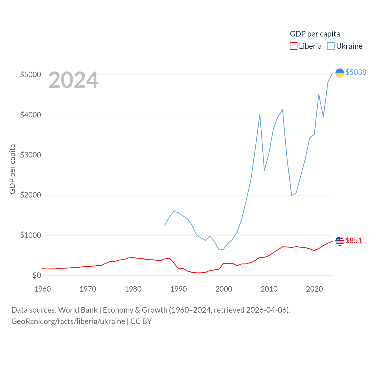 By GDP, Liberia ranks 163/197 ($4.78B) and Ukraine ranks 57/197 ($191B). By GDP per capita, Liberia ranks 184/197 ($851), while Ukraine ranks 120/197 ($5,038).