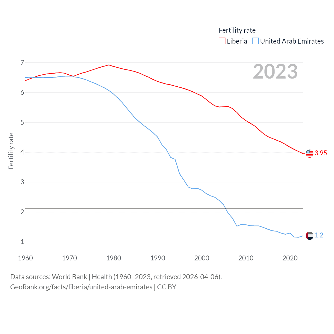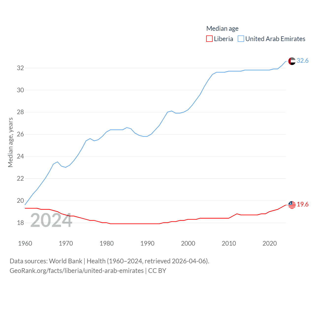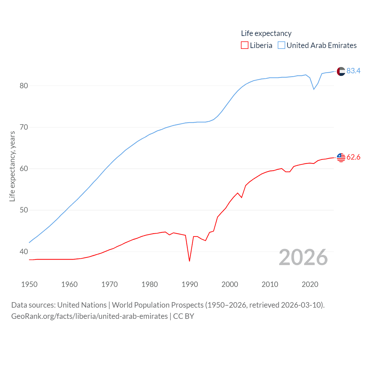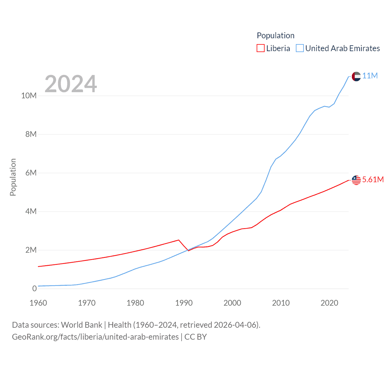 Liberia has a population of 5.61M (ranked 117/197), compared with 11M in The United Arab Emirates (ranked 86/197). Liberia's land area is 37,189 sq mi versus 27,421 sq mi for The United Arab Emirates (ranked 106th vs. 117th).