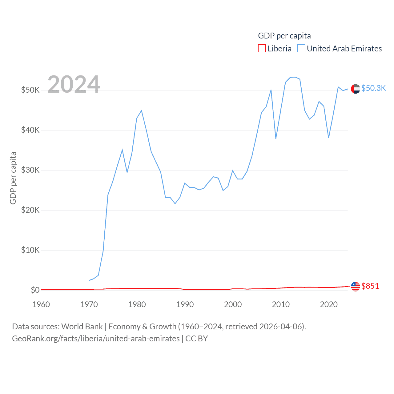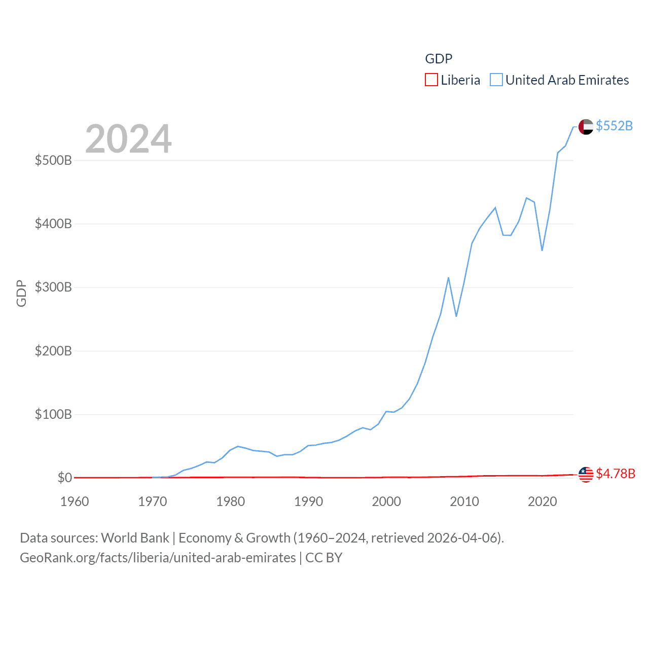 By GDP, Liberia ranks 163/197 ($4.78B) and The United Arab Emirates ranks 27/197 ($552B). By GDP per capita, Liberia ranks 184/197 ($851), while The United Arab Emirates ranks 24/197 ($50,274).