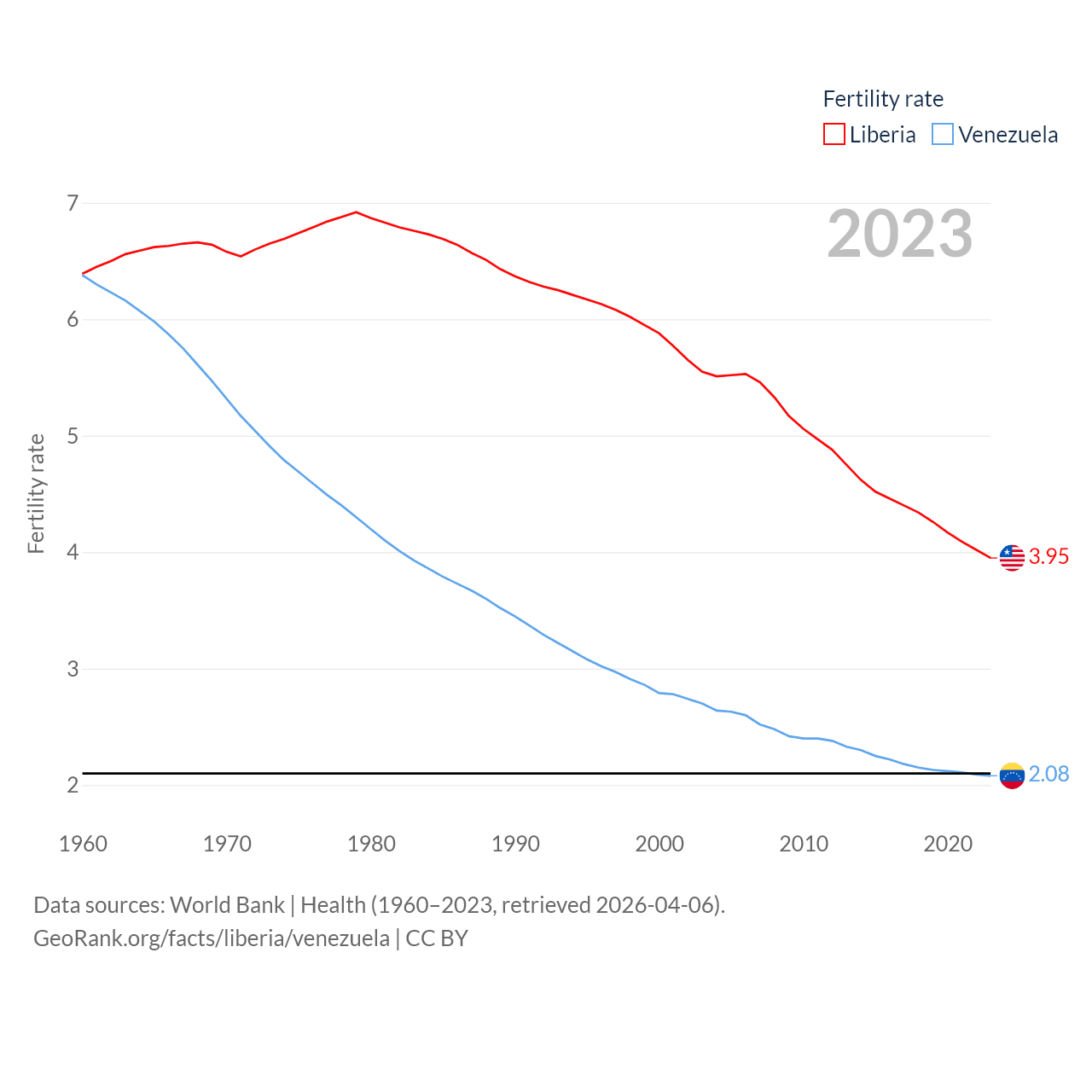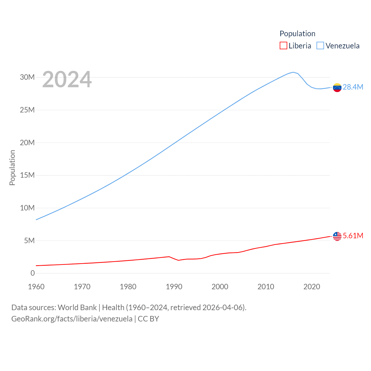 Liberia has a population of 5.61M (ranked 117/197), compared with 28.4M in Venezuela (ranked 53/197). Liberia's land area is 37,189 sq mi versus 340,561 sq mi for Venezuela (ranked 106th vs. 32nd).