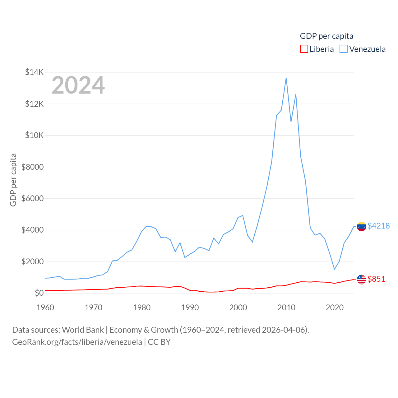 By GDP, Liberia ranks 163/197 ($4.78B) and Venezuela ranks 65/197 ($120B). By GDP per capita, Liberia ranks 184/197 ($851), while Venezuela ranks 128/197 ($4,218).