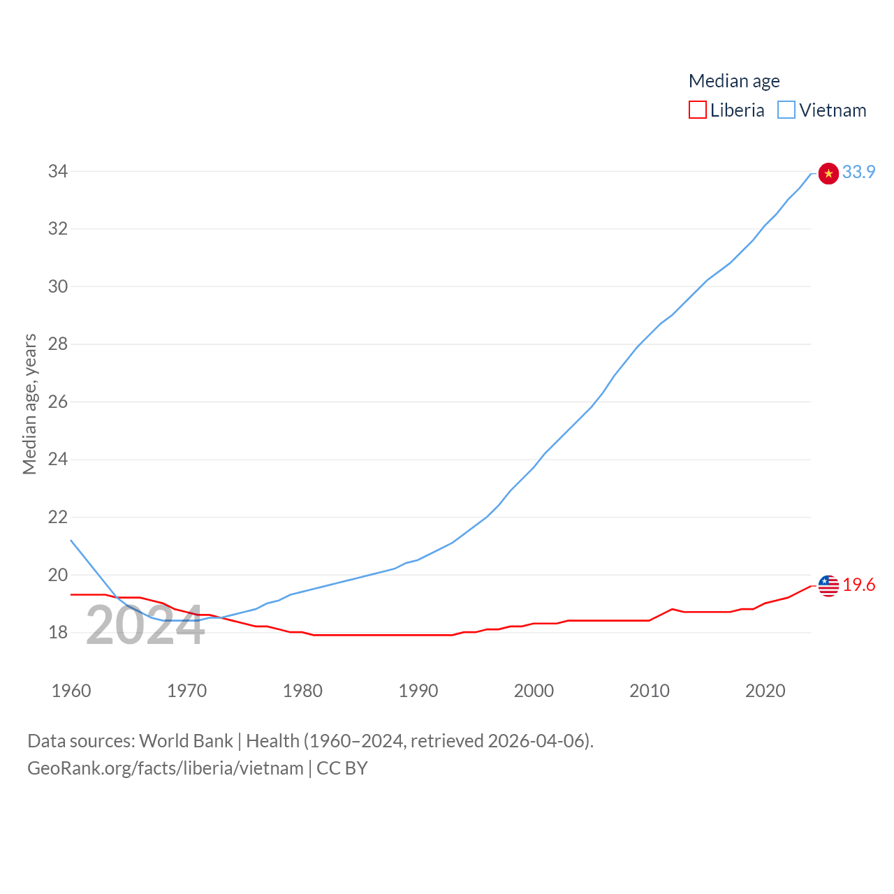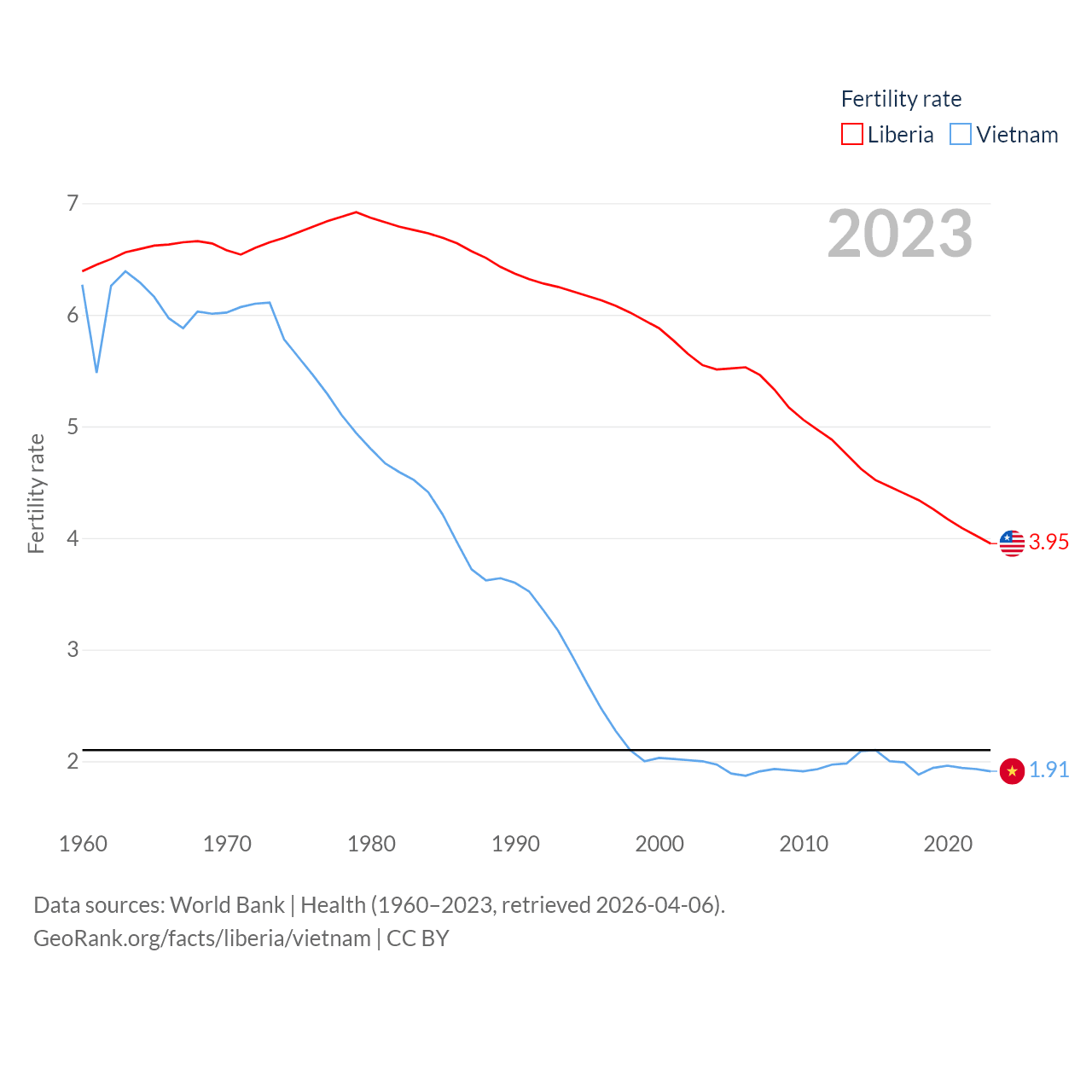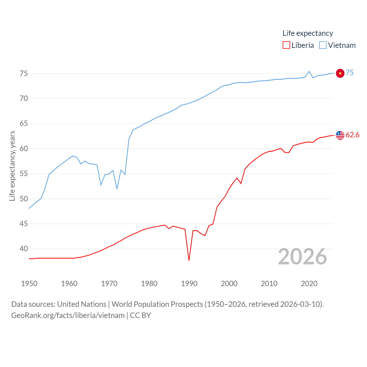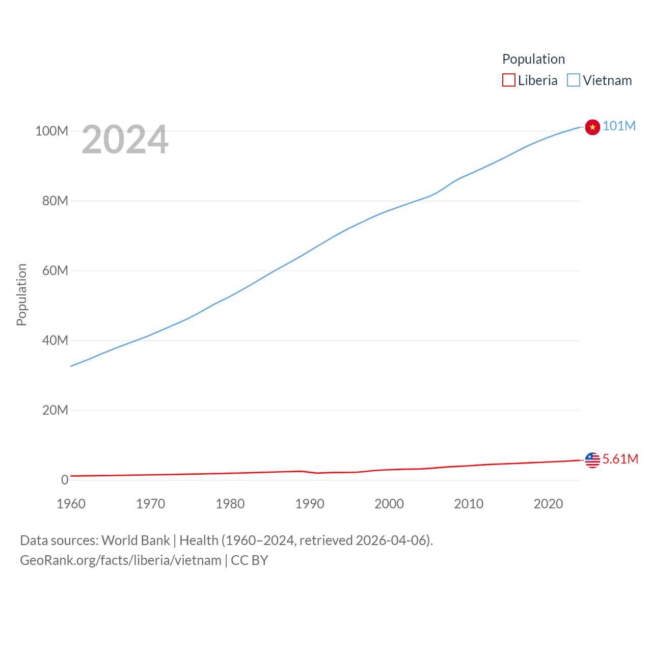 Liberia has a population of 5.61M (ranked 117/197), compared with 101M in Vietnam (ranked 16/197). Liberia's land area is 37,189 sq mi versus 121,016 sq mi for Vietnam (ranked 106th vs. 67th).