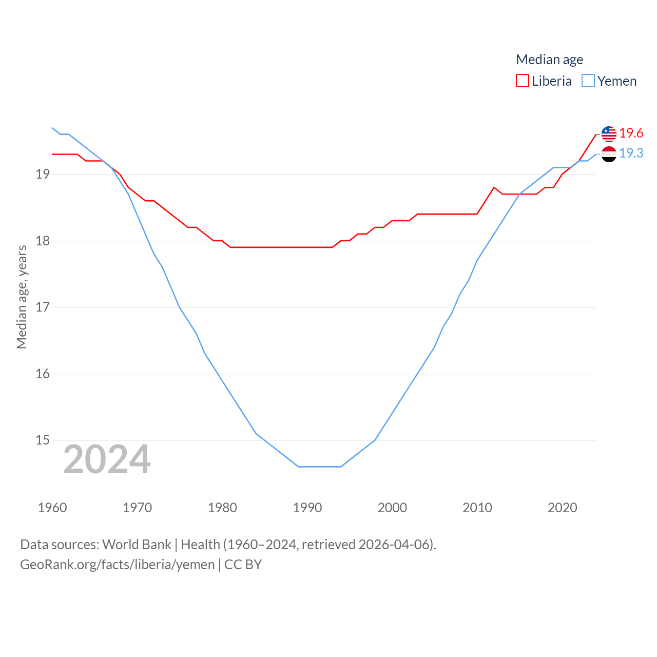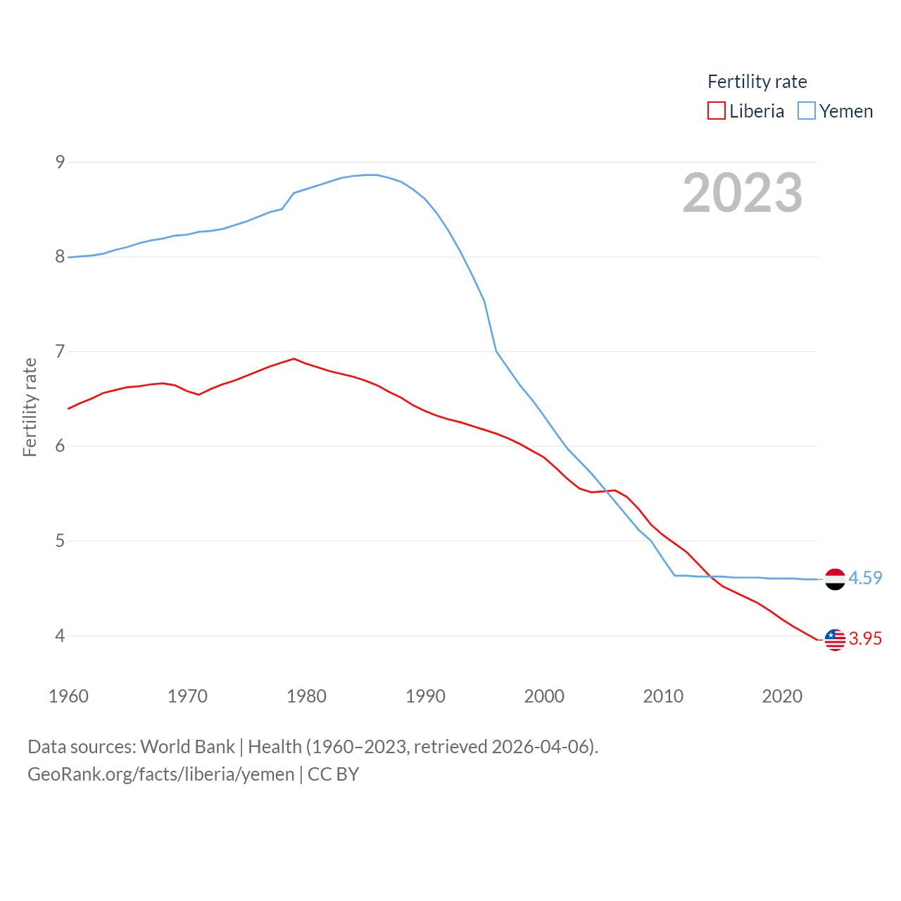 Liberia has a population of 5.61M (ranked 117/197), compared with 40.6M in Yemen (ranked 38/197). Liberia's land area is 37,189 sq mi versus 203,850 sq mi for Yemen (ranked 106th vs. 49th).