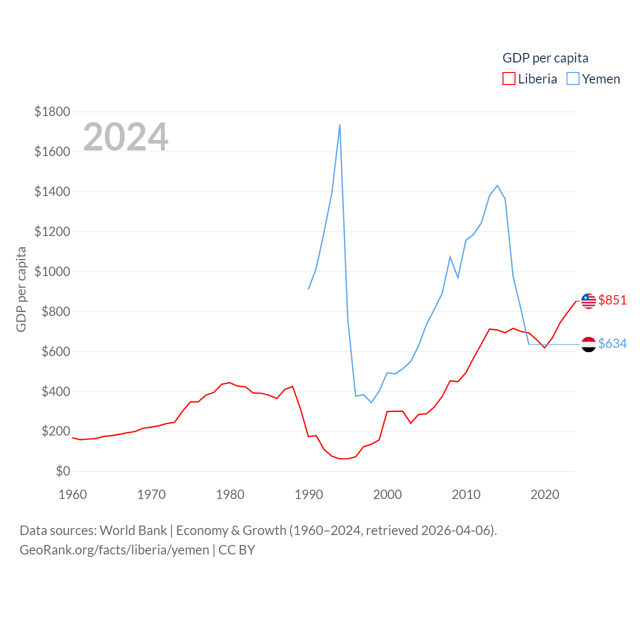 By GDP, Liberia ranks 163/197 ($4.78B) and Yemen ranks 125/197 ($21.6B). By GDP per capita, Liberia ranks 184/197 ($851), while Yemen ranks 191/197 ($634).