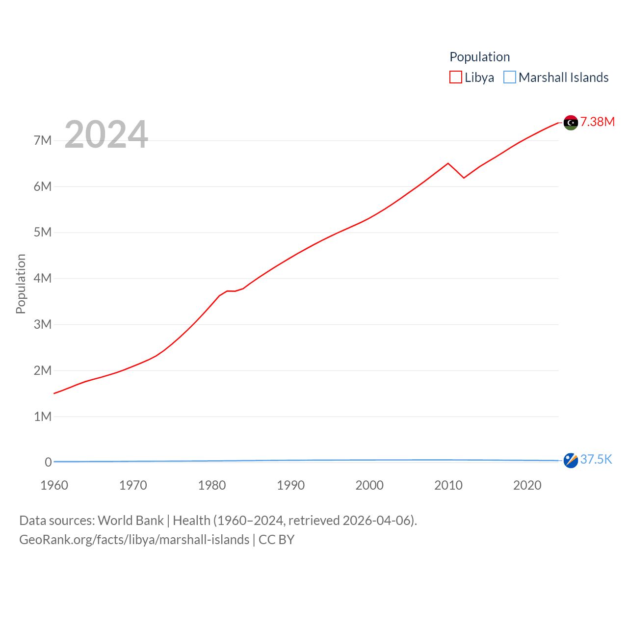 Libya has a population of 7.38M (ranked 105/197), compared with 37.5K in The Marshall Islands (ranked 192/197). Libya's land area is 679,362 sq mi versus 69.5 sq mi for The Marshall Islands (ranked 16th vs. 191st).