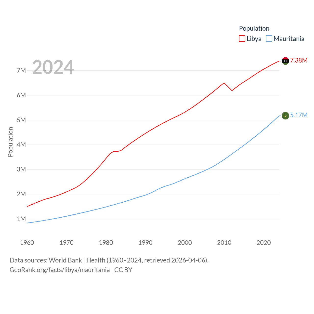 Libya has a population of 7.38M (ranked 105/197), compared with 5.17M in Mauritania (ranked 125/197). Libya's land area is 679,362 sq mi versus 397,955 sq mi for Mauritania (ranked 16th vs. 28th).