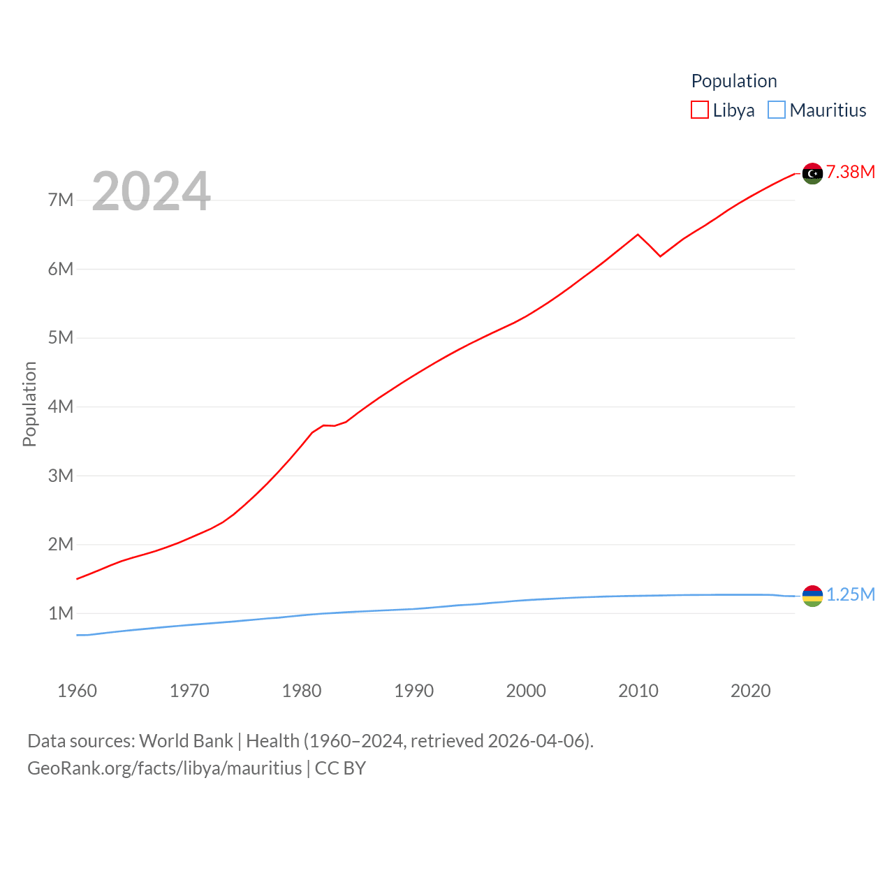 Libya has a population of 7.38M (ranked 105/197), compared with 1.25M in Mauritius (ranked 156/197). Libya's land area is 679,362 sq mi versus 771 sq mi for Mauritius (ranked 16th vs. 170th).