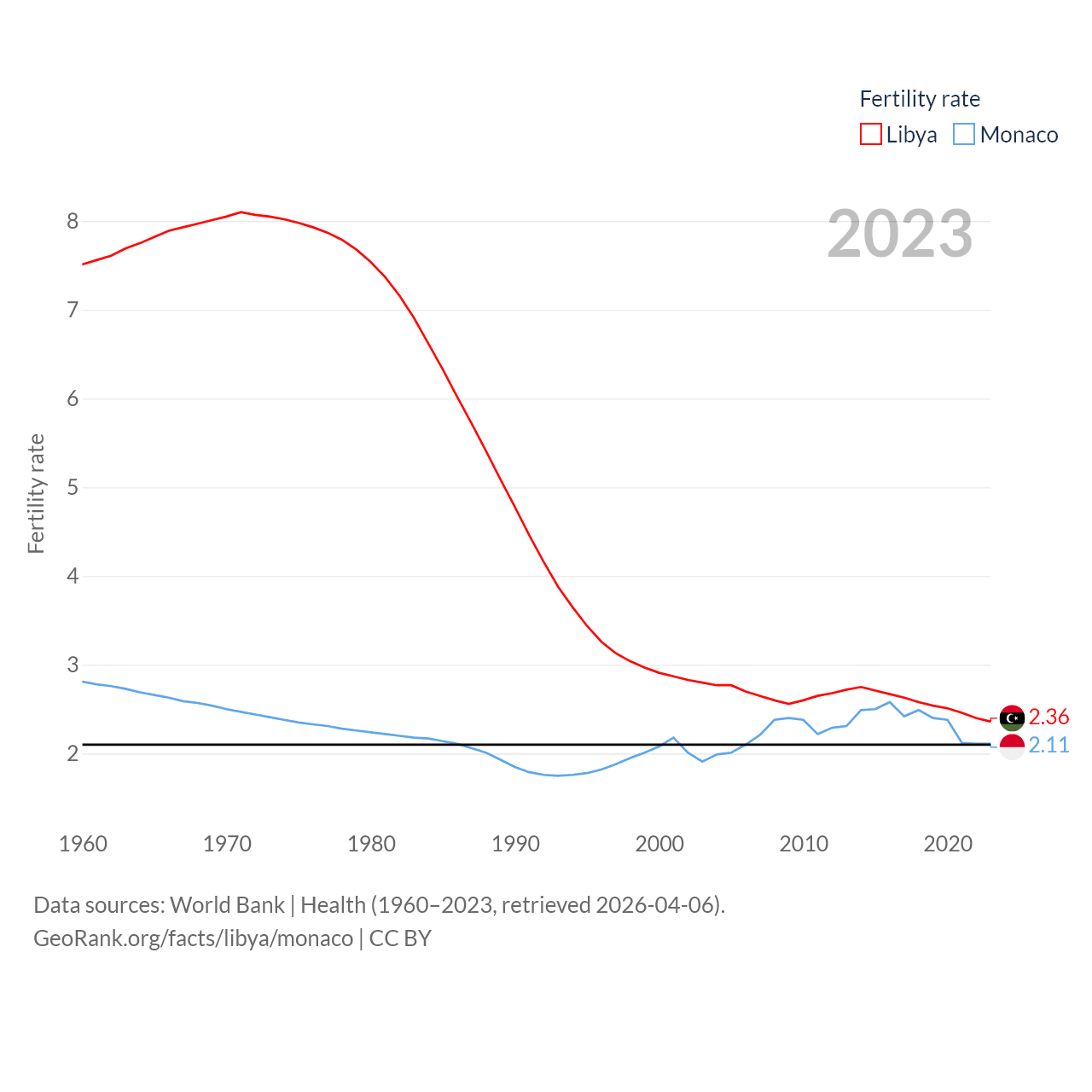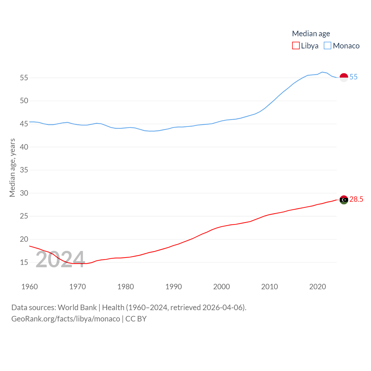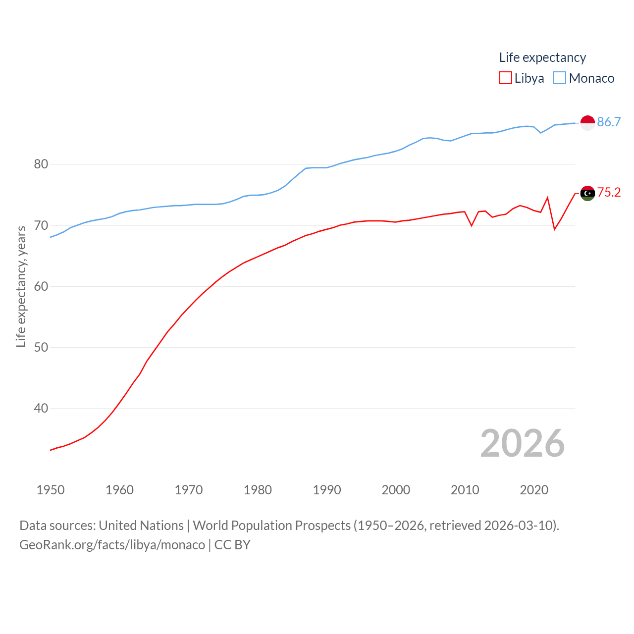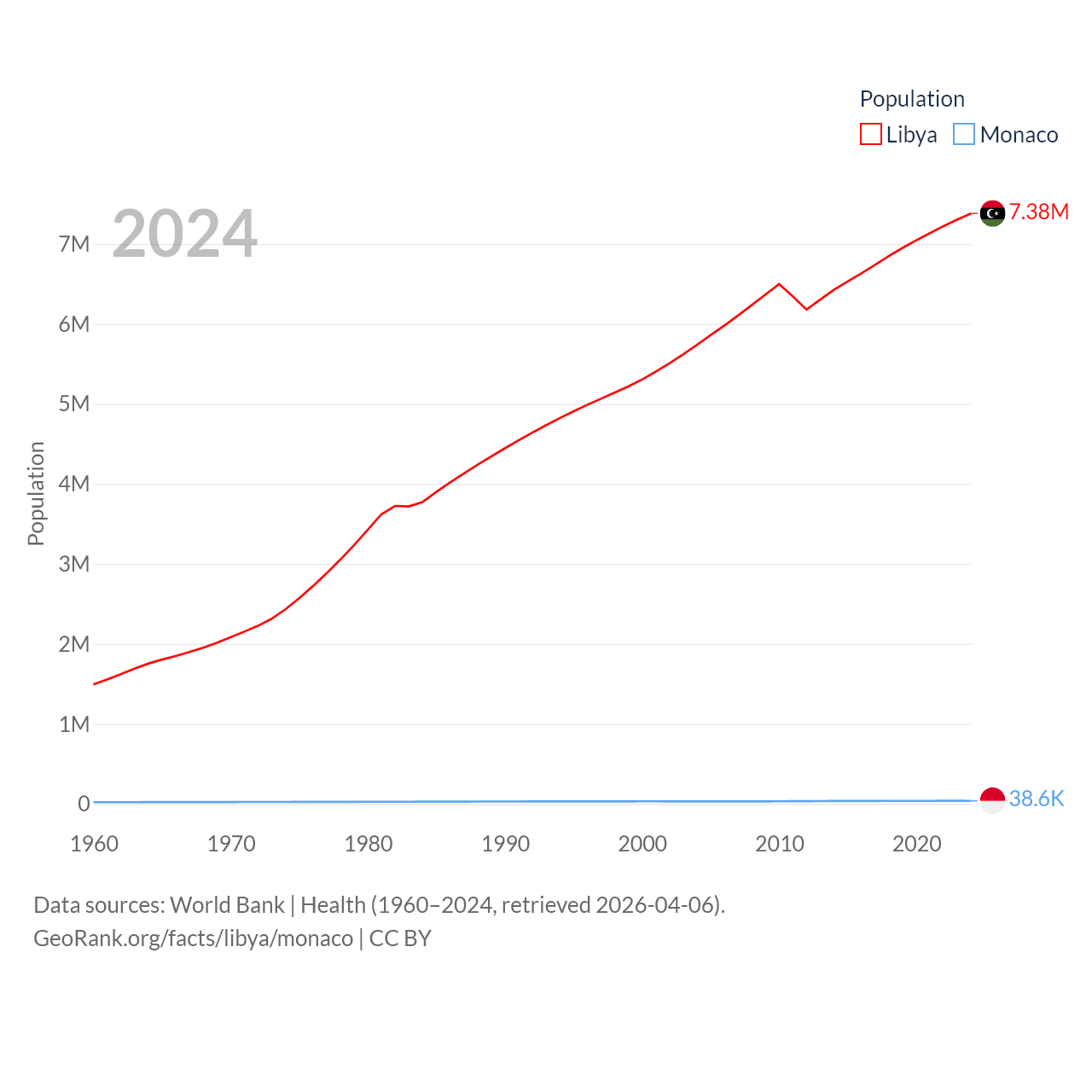 Libya has a population of 7.38M (ranked 105/197), compared with 38.6K in Monaco (ranked 191/197). Libya's land area is 679,362 sq mi versus 0.8 sq mi for Monaco (ranked 16th vs. 196th).