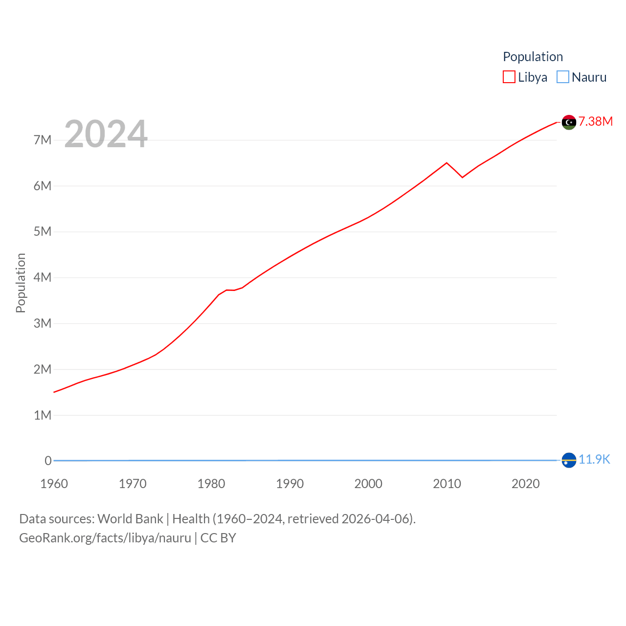 Libya has a population of 7.38M (ranked 105/197), compared with 11.9K in Nauru (ranked 195/197). Libya's land area is 679,362 sq mi versus 7.72 sq mi for Nauru (ranked 16th vs. 195th).