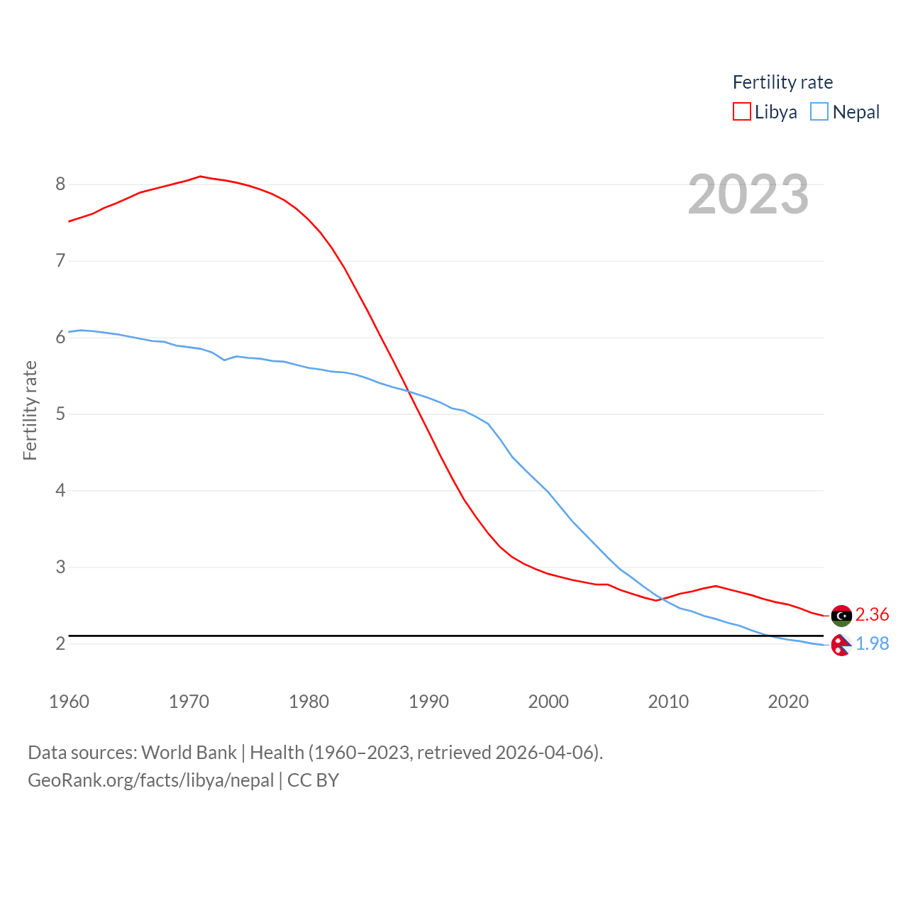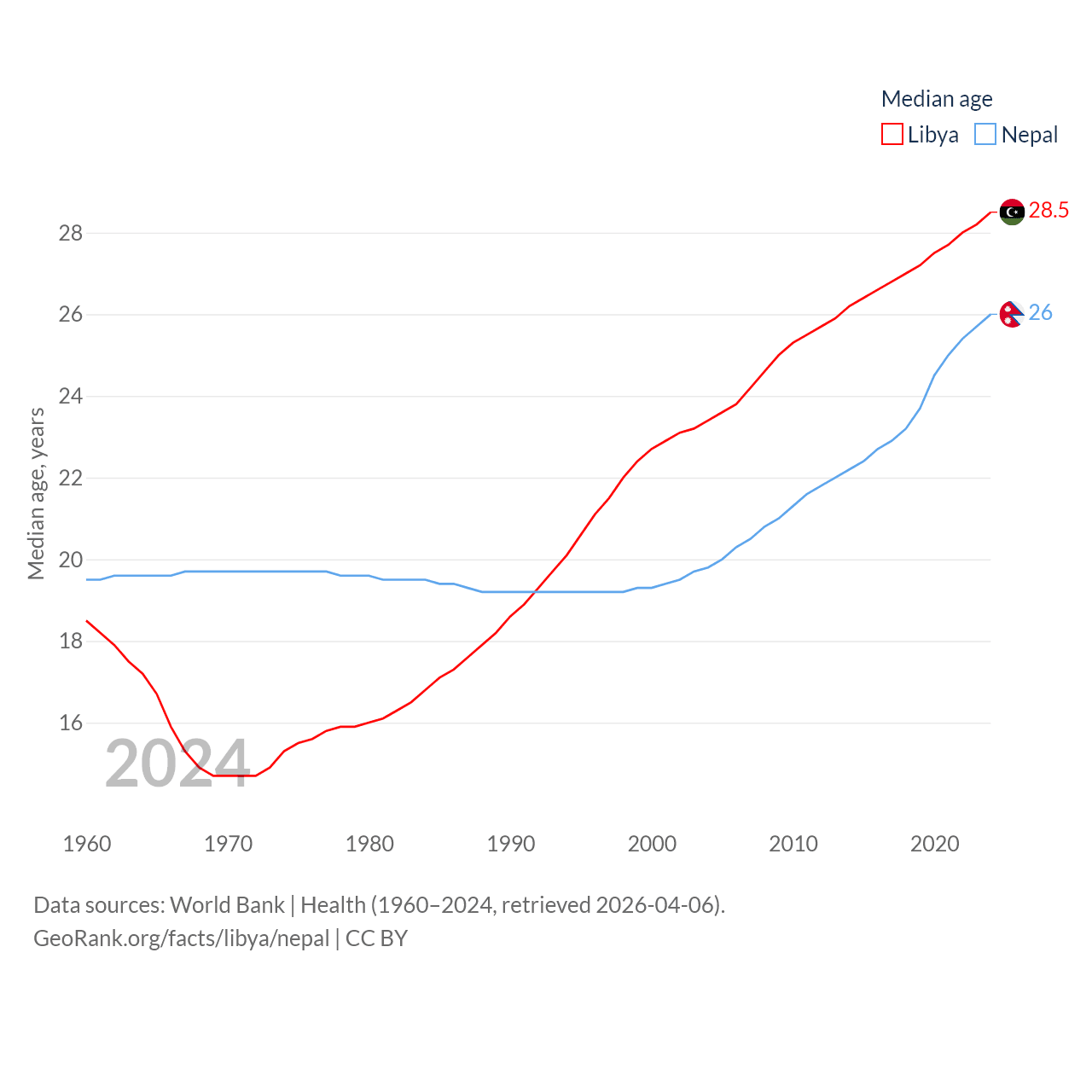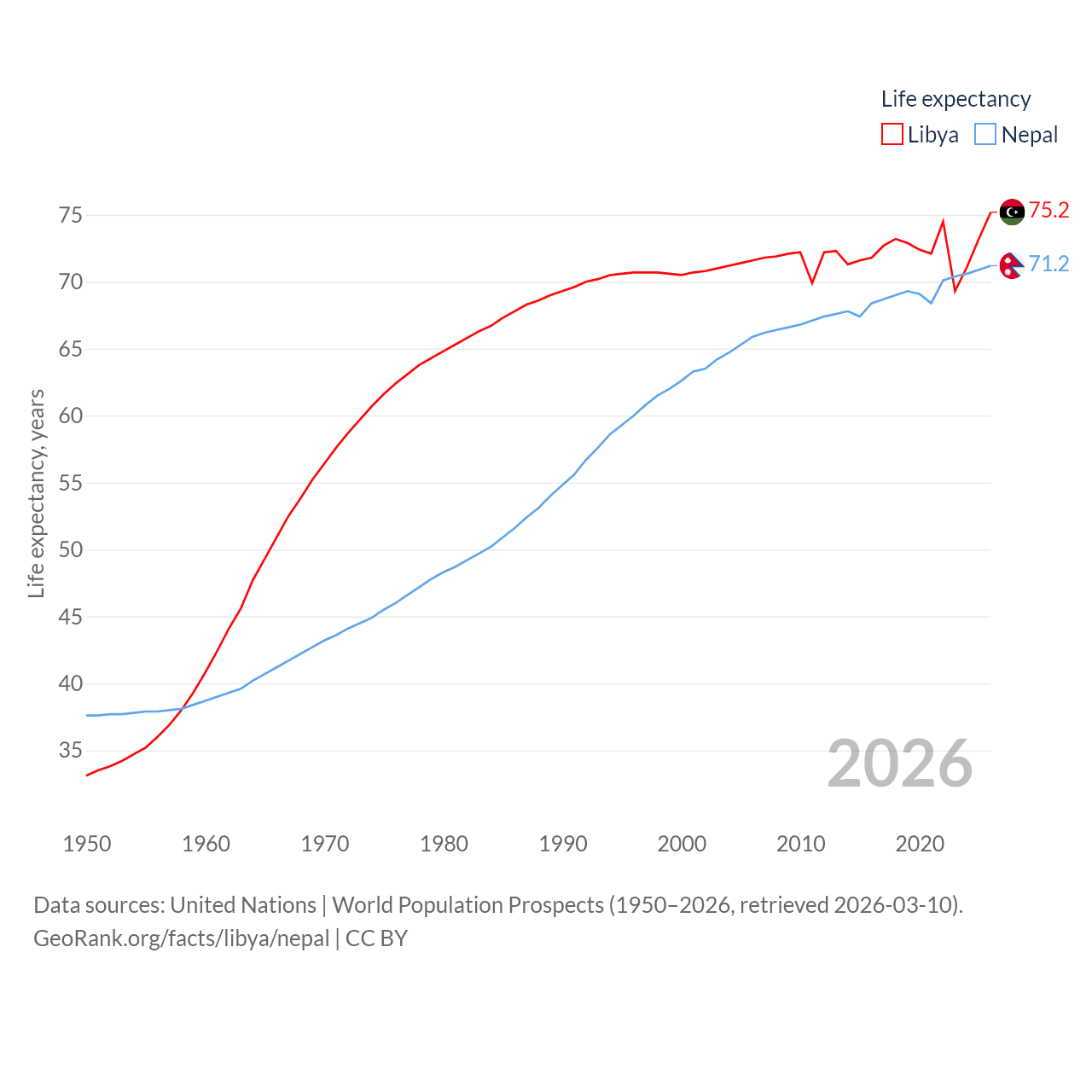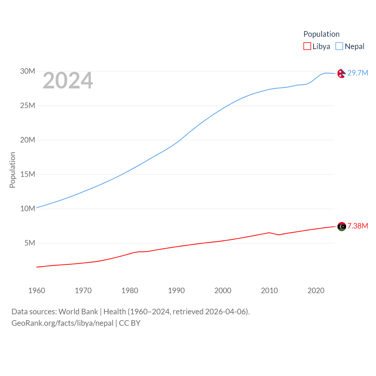 Libya has a population of 7.38M (ranked 105/197), compared with 29.7M in Nepal (ranked 51/197). Libya's land area is 679,362 sq mi versus 55,348 sq mi for Nepal (ranked 16th vs. 92nd).