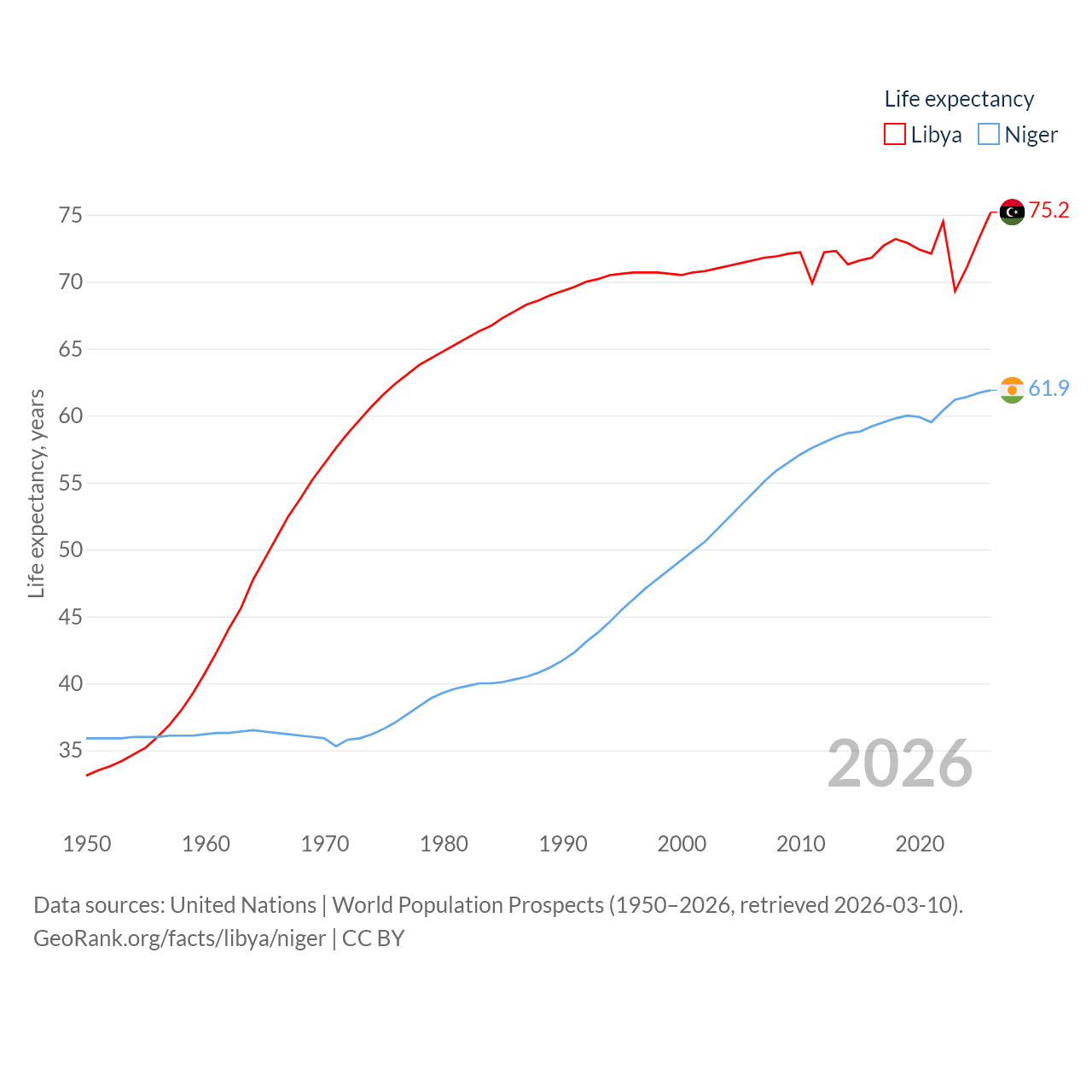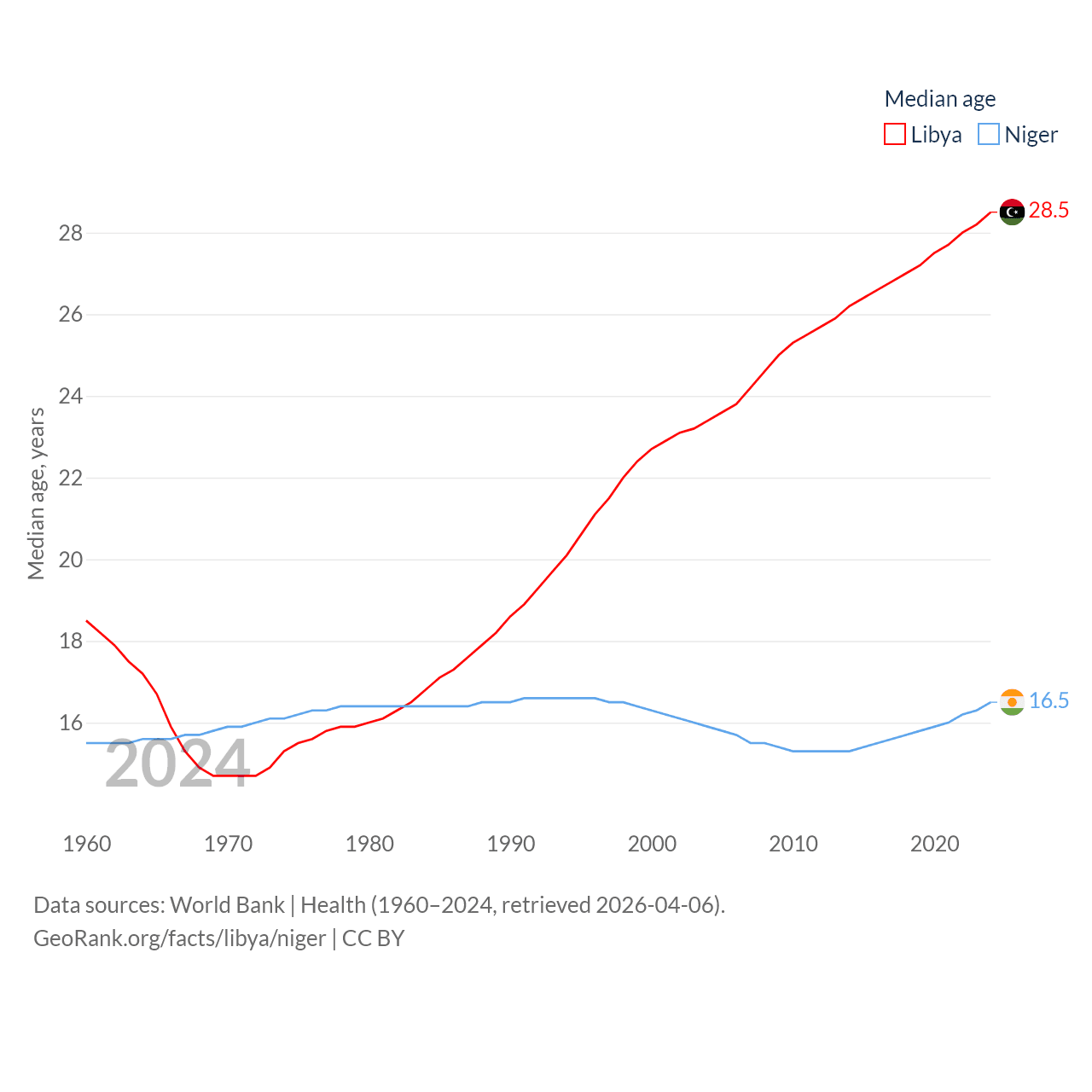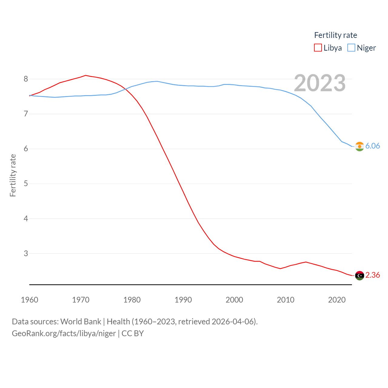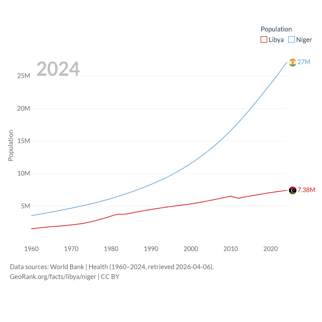Libya has a population of 7.38M (ranked 105/197), compared with 27M in Niger (ranked 55/197). Libya's land area is 679,362 sq mi versus 489,076 sq mi for Niger (ranked 16th vs. 20th).