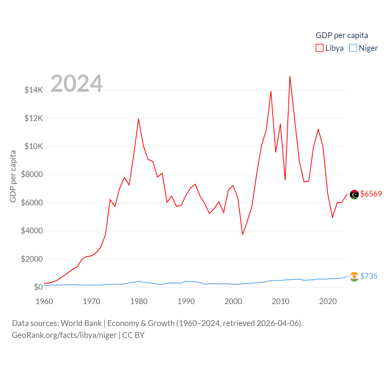 By GDP, Libya ranks 95/197 ($48.5B) and Niger ranks 130/197 ($19.9B). By GDP per capita, Libya ranks 107/197 ($6,569), while Niger ranks 187/197 ($735).