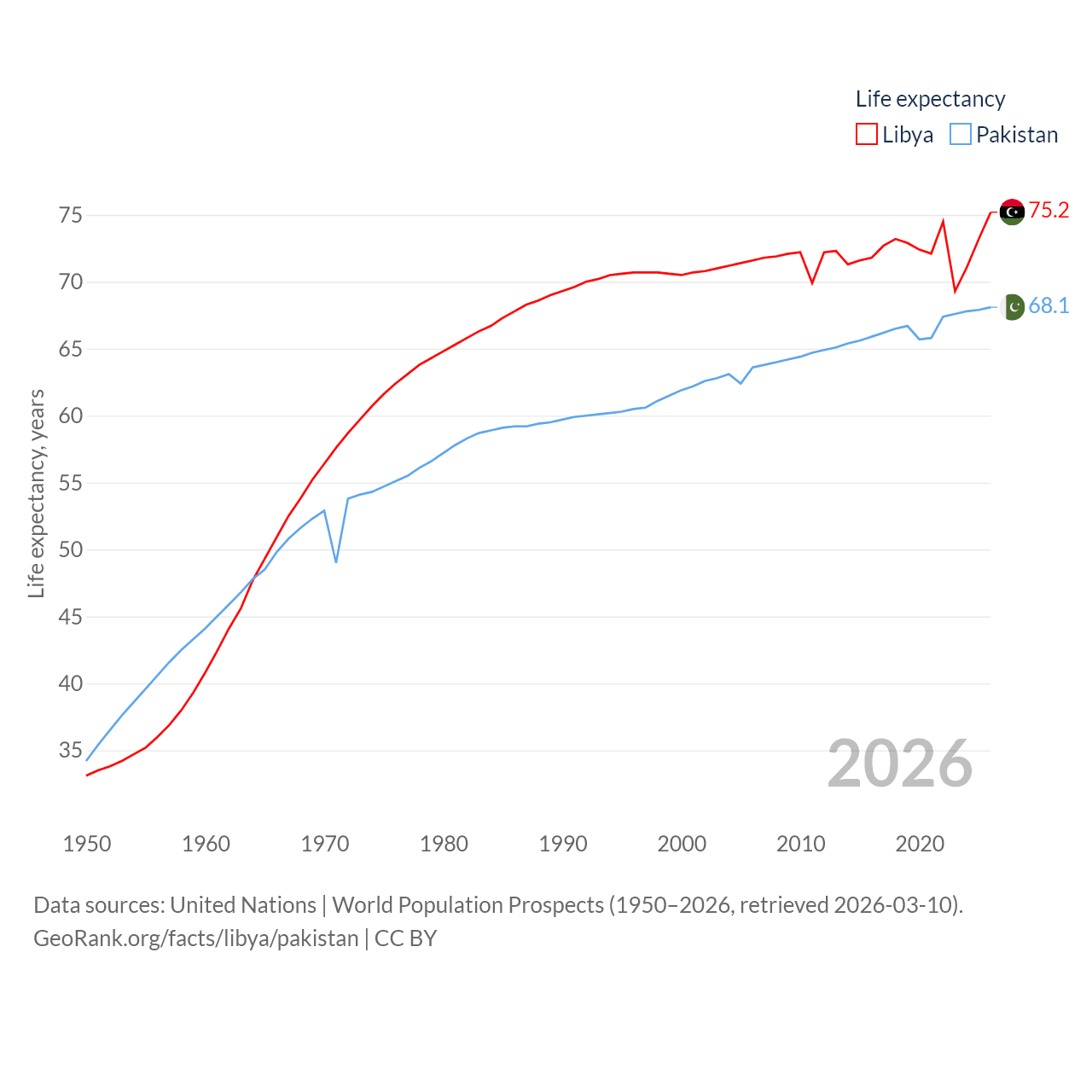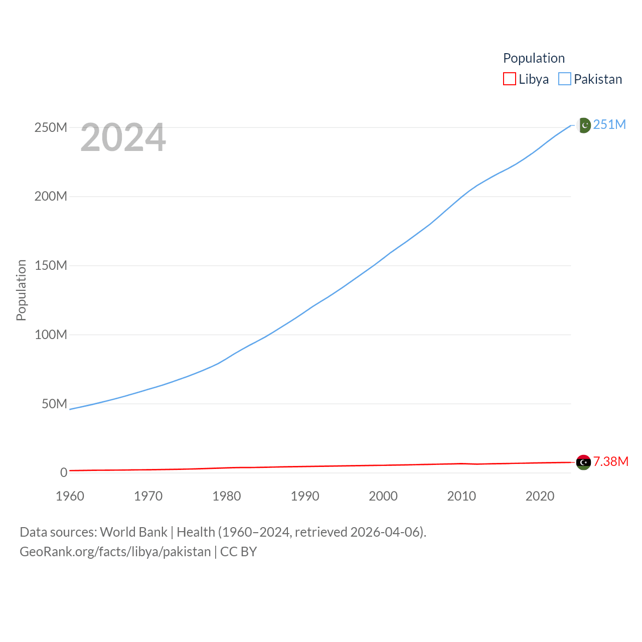 Libya has a population of 7.38M (ranked 105/197), compared with 251M in Pakistan (ranked 5/197). Libya's land area is 679,362 sq mi versus 297,638 sq mi for Pakistan (ranked 16th vs. 35th).
