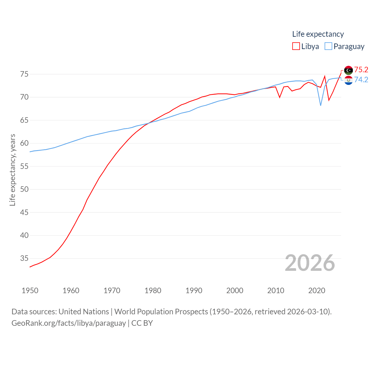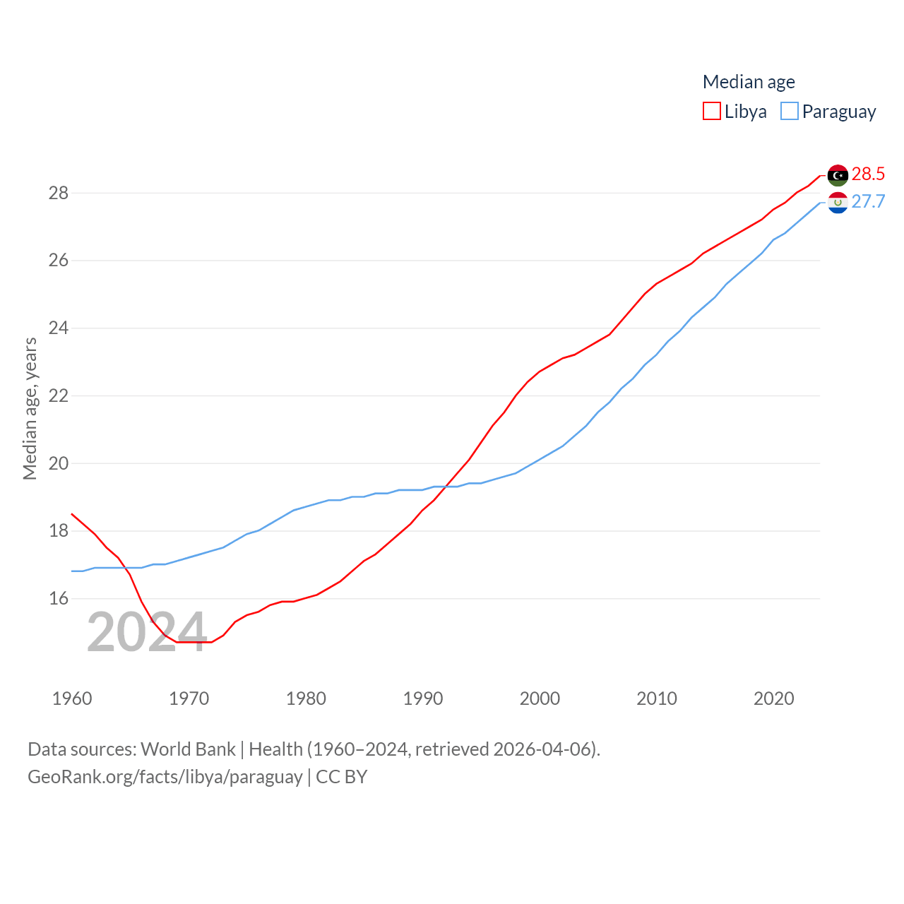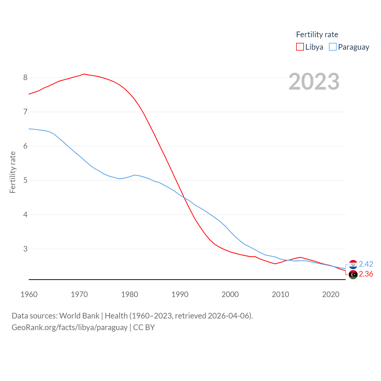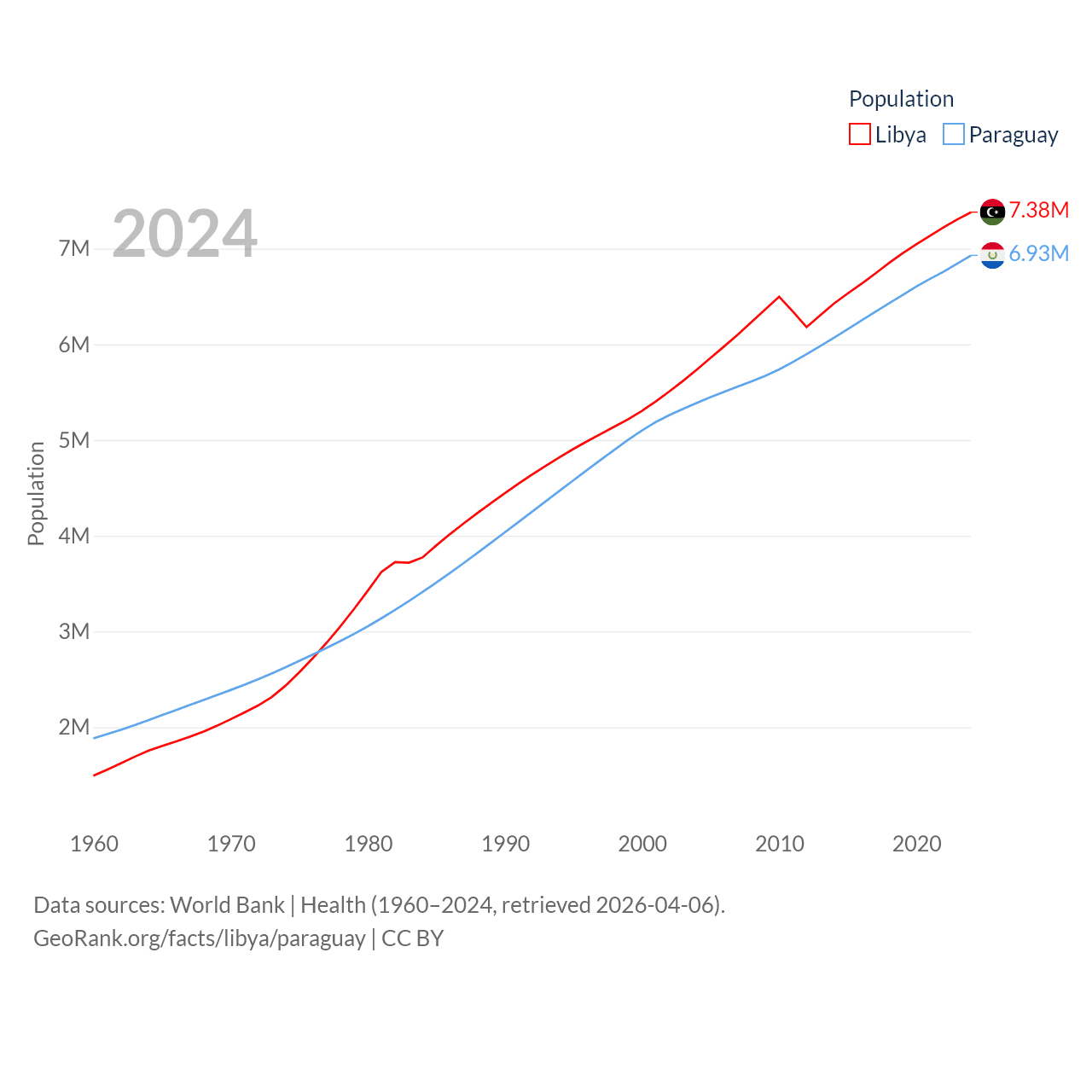 Libya has a population of 7.38M (ranked 105/197), compared with 6.93M in Paraguay (ranked 107/197). Libya's land area is 679,362 sq mi versus 152,901 sq mi for Paraguay (ranked 16th vs. 59th).