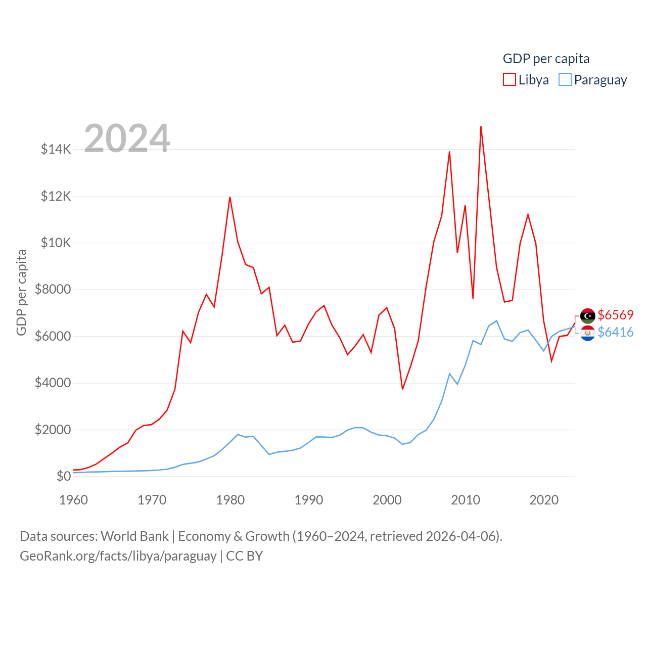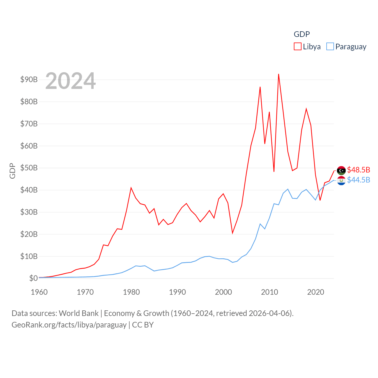 By GDP, Libya ranks 95/197 ($48.5B) and Paraguay ranks 98/197 ($44.5B). By GDP per capita, Libya ranks 107/197 ($6,569), while Paraguay ranks 109/197 ($6,416).