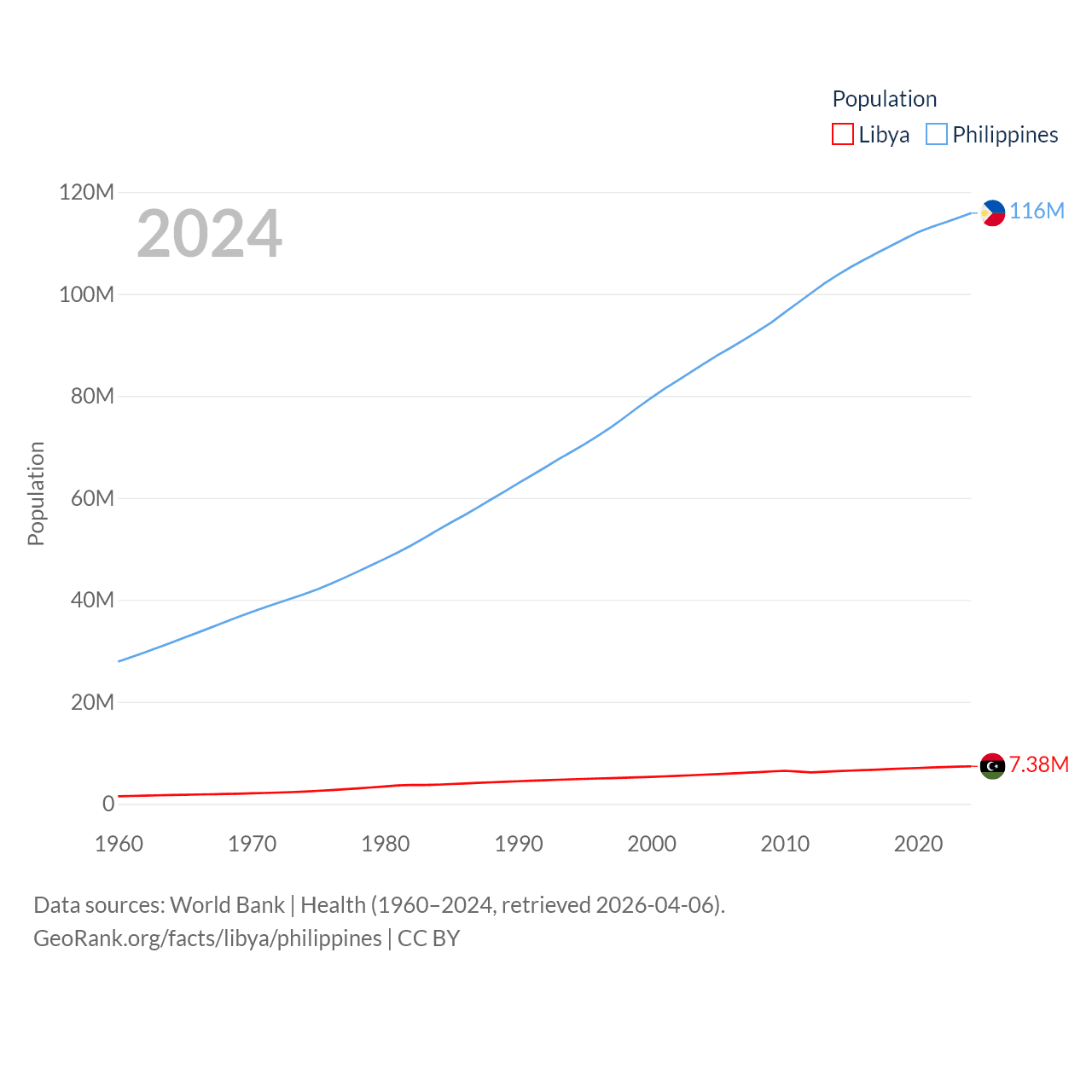 Libya has a population of 7.38M (ranked 105/197), compared with 116M in The Philippines (ranked 14/197). Libya's land area is 679,362 sq mi versus 115,124 sq mi for The Philippines (ranked 16th vs. 71st).