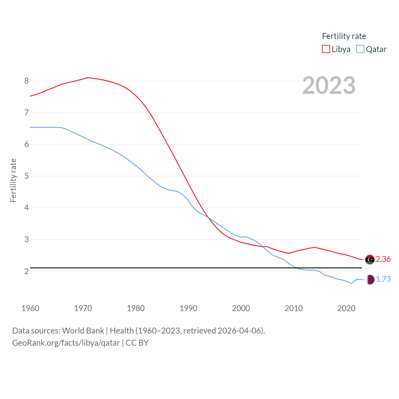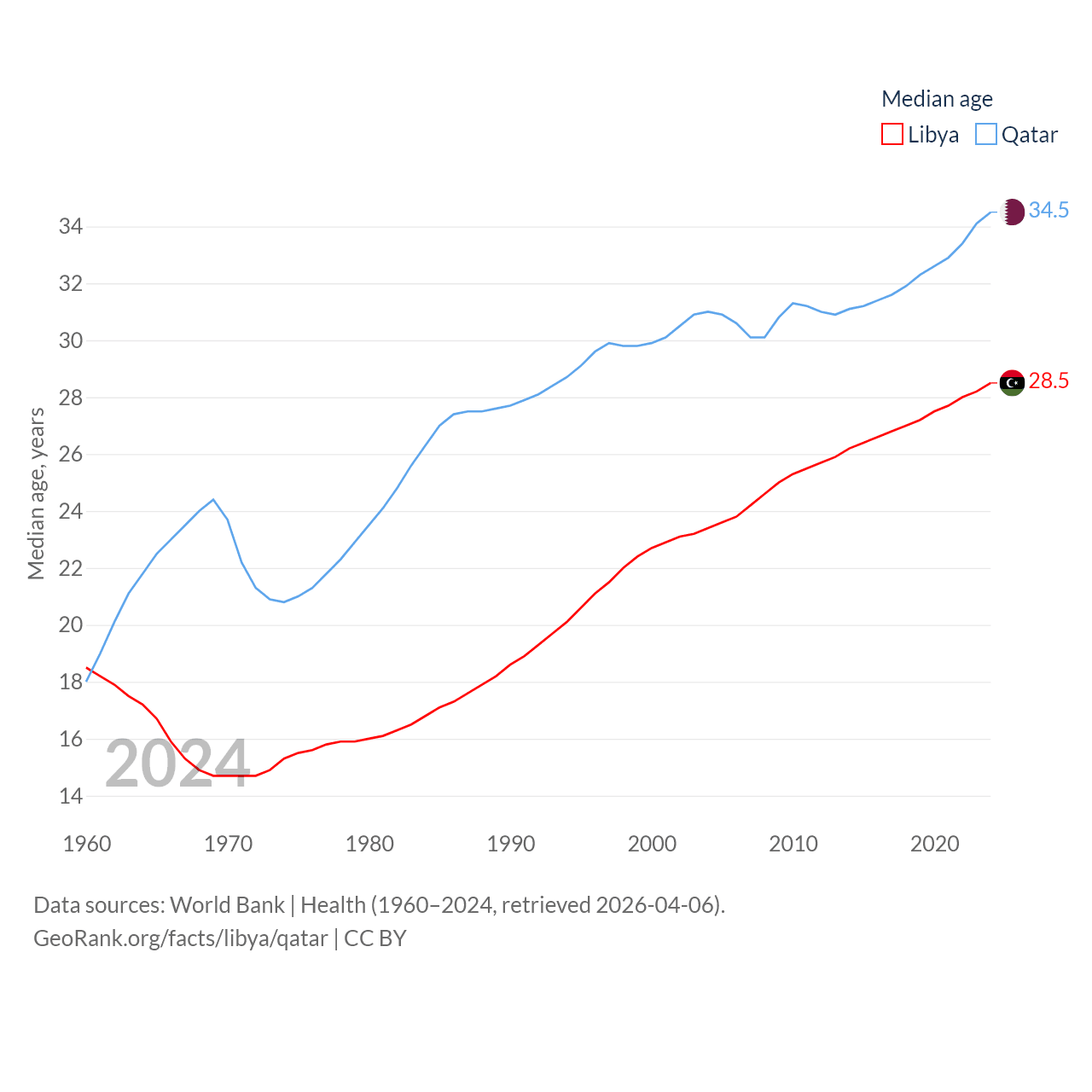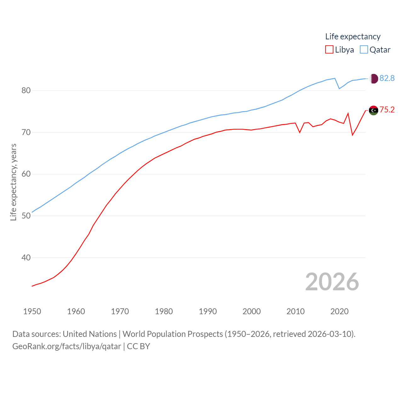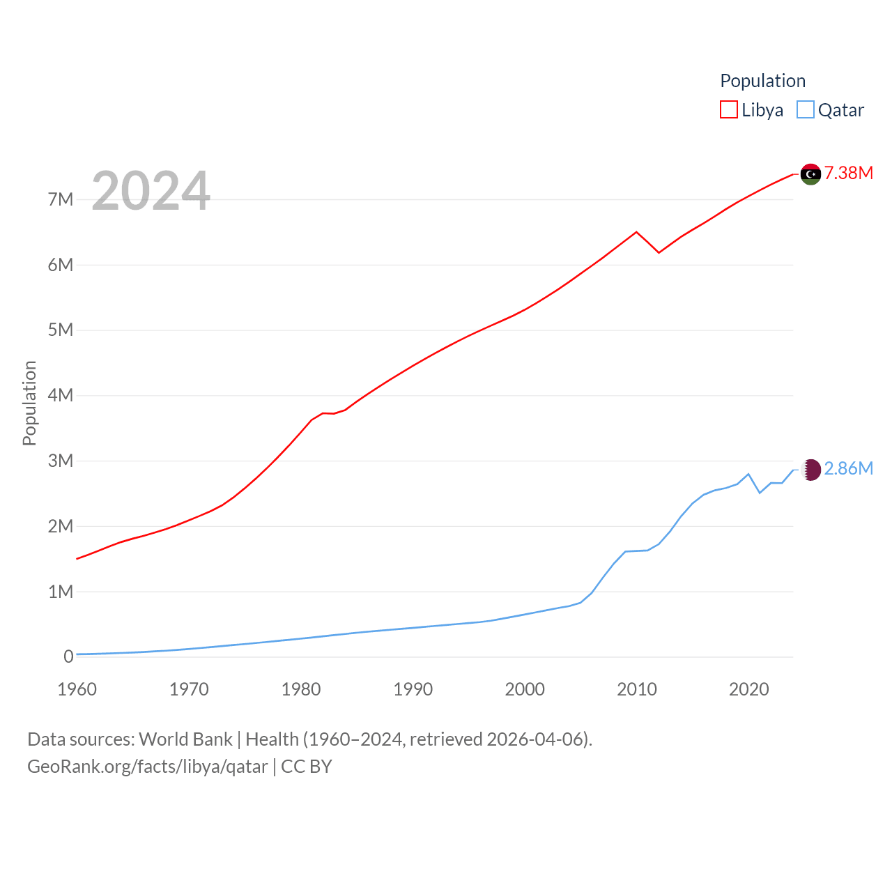 Libya has a population of 7.38M (ranked 105/197), compared with 2.86M in Qatar (ranked 138/197). Libya's land area is 679,362 sq mi versus 4,436 sq mi for Qatar (ranked 16th vs. 158th).