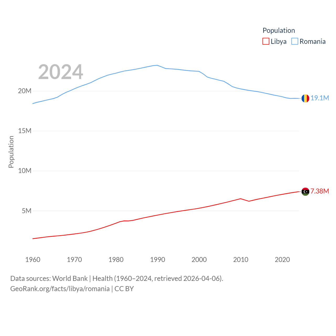 Libya has a population of 7.38M (ranked 105/197), compared with 19.1M in Romania (ranked 67/197). Libya's land area is 679,362 sq mi versus 88,834 sq mi for Romania (ranked 16th vs. 80th).