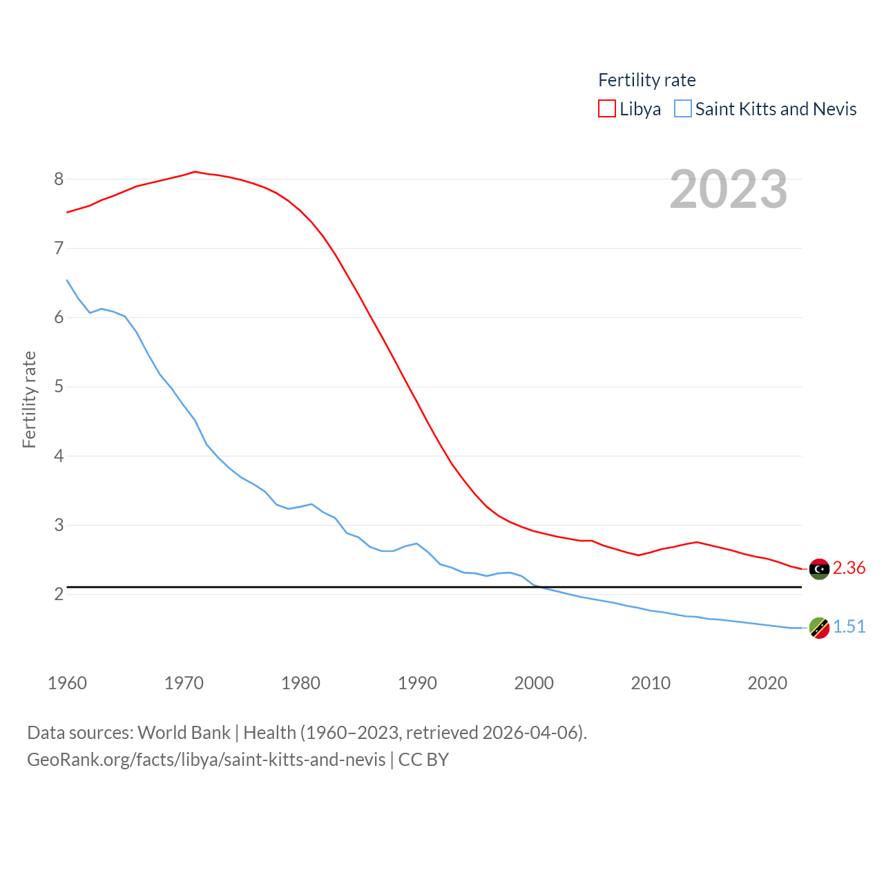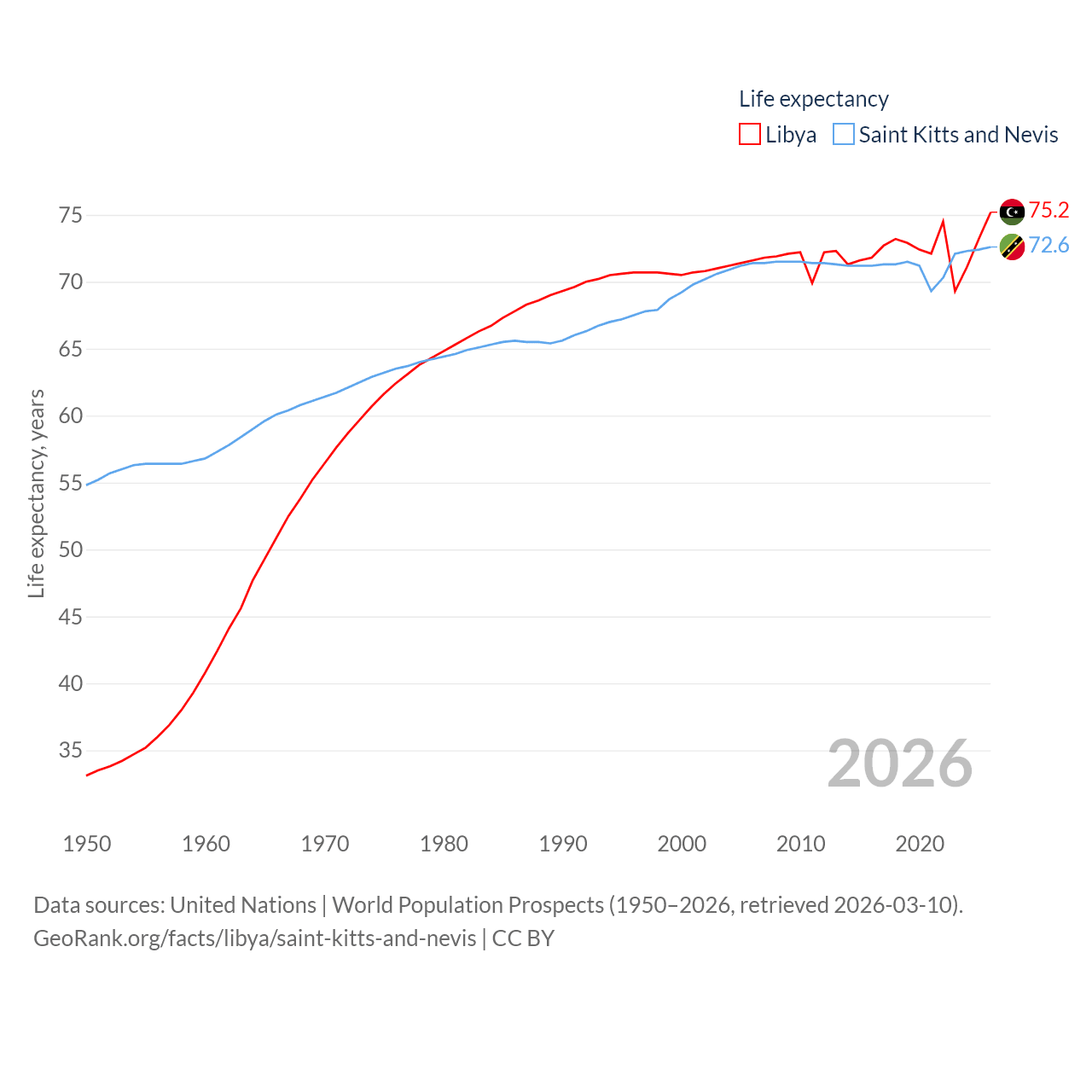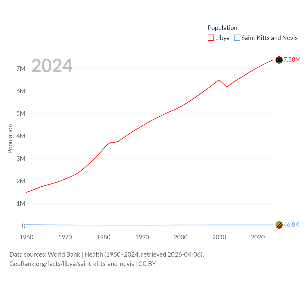 Libya has a population of 7.38M (ranked 105/197), compared with 46.8K in Saint Kitts and Nevis (ranked 189/197). Libya's land area is 679,362 sq mi versus 100.4 sq mi for Saint Kitts and Nevis (ranked 16th vs. 189th).