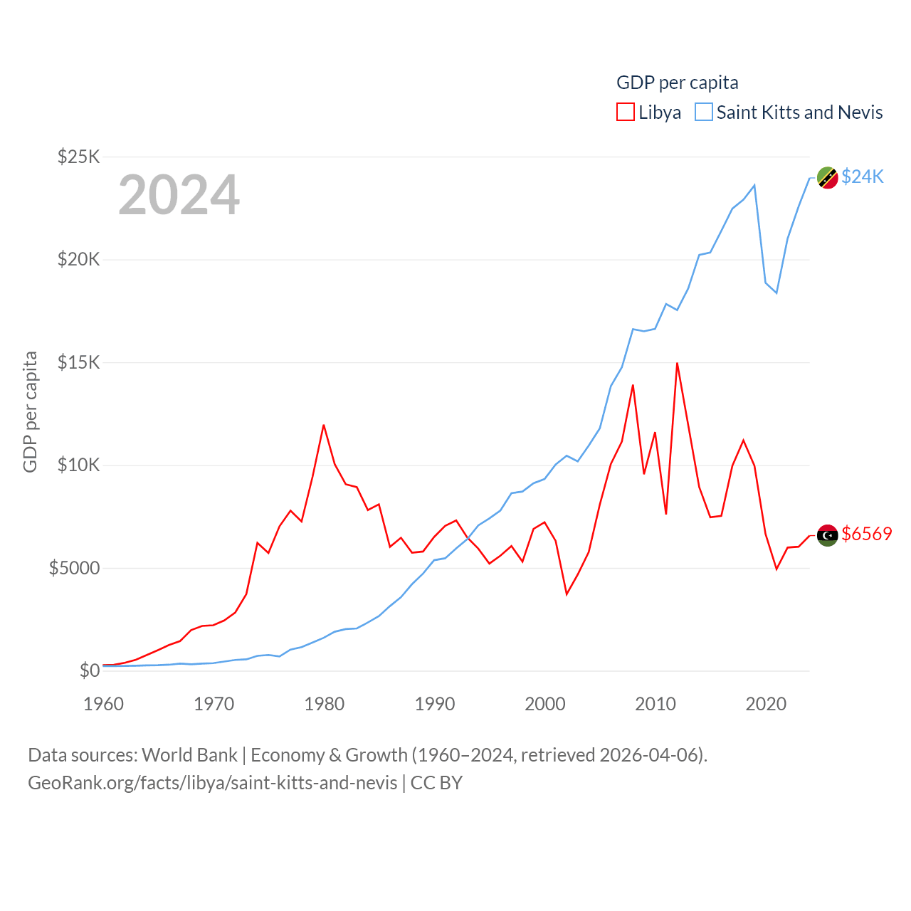 By GDP, Libya ranks 95/197 ($48.5B) and Saint Kitts and Nevis ranks 187/197 ($1.12B). By GDP per capita, Libya ranks 107/197 ($6,569), while Saint Kitts and Nevis ranks 51/197 ($23,961).