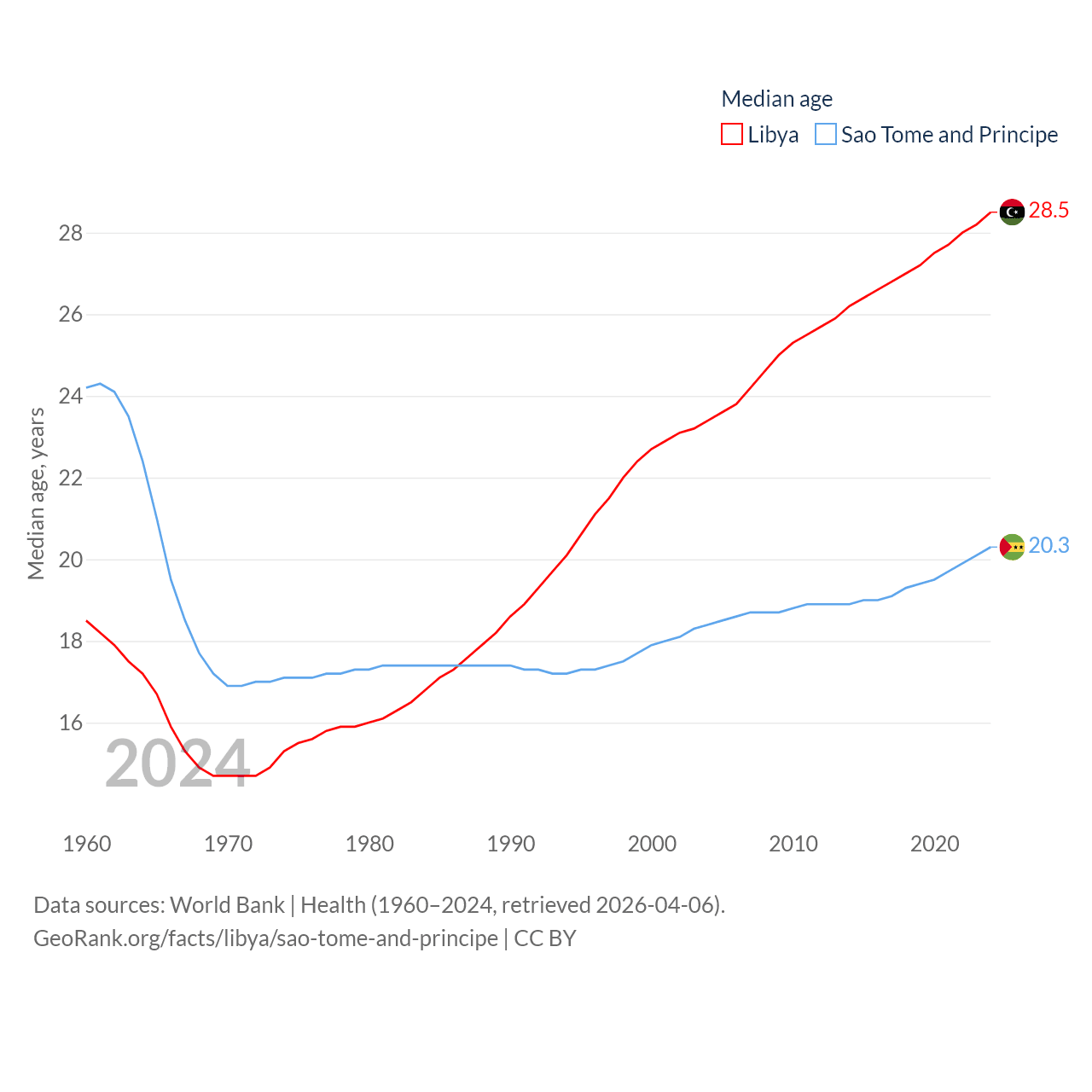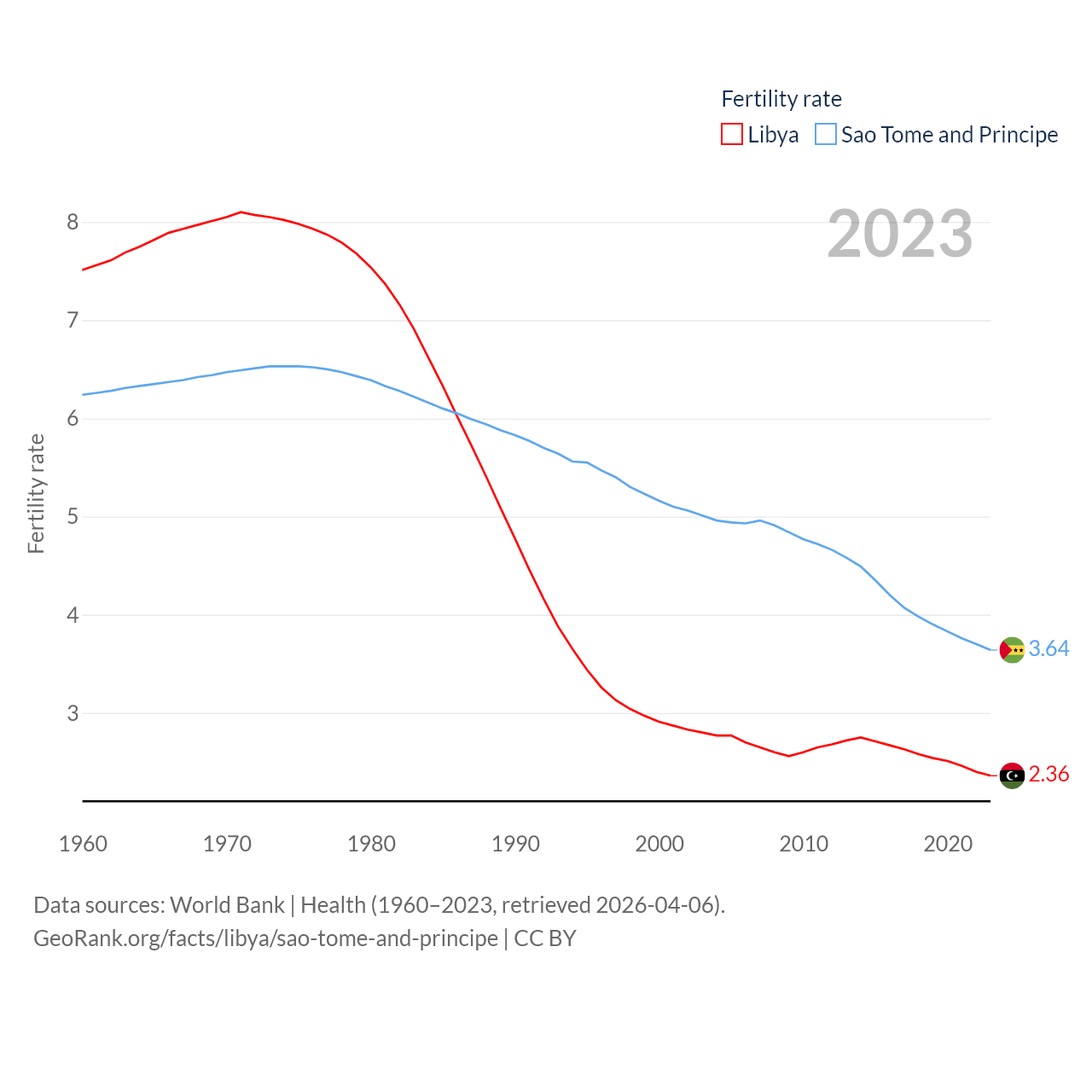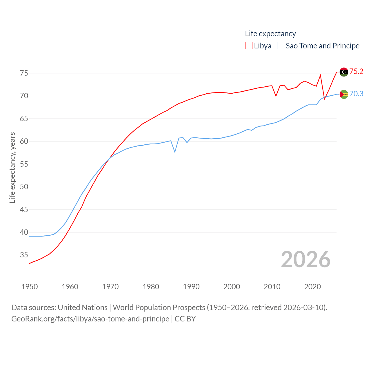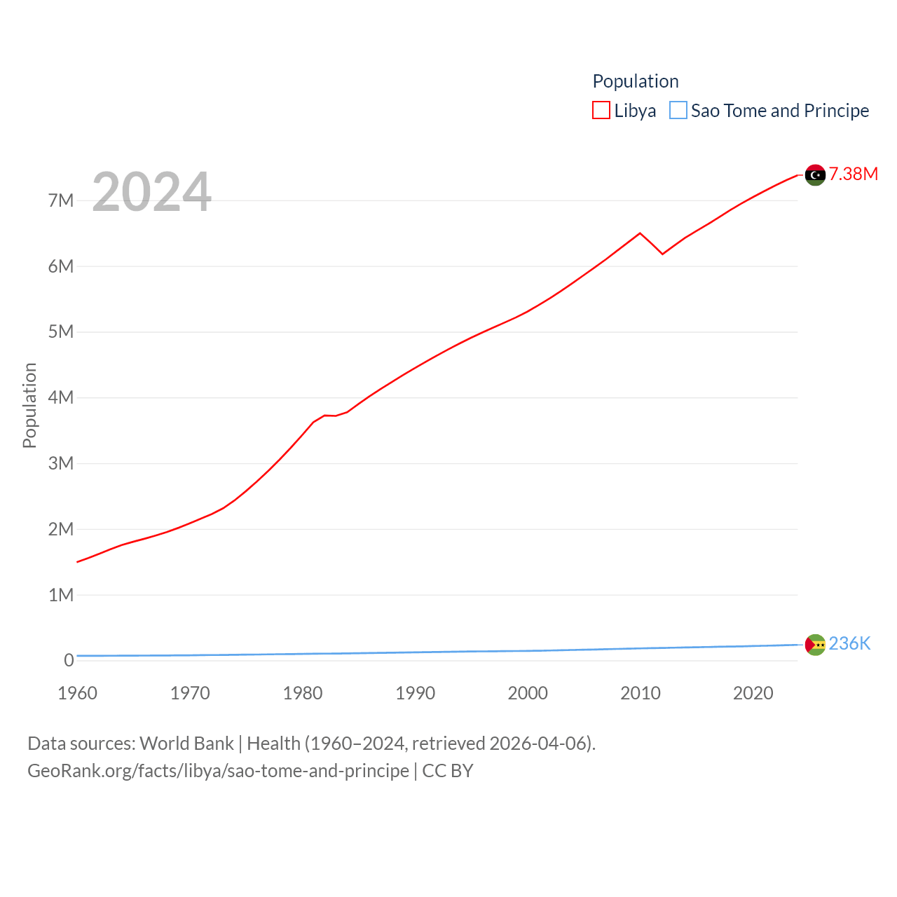 Libya has a population of 7.38M (ranked 105/197), compared with 236K in Sao Tome and Principe (ranked 176/197). Libya's land area is 679,362 sq mi versus 371 sq mi for Sao Tome and Principe (ranked 16th vs. 172nd).