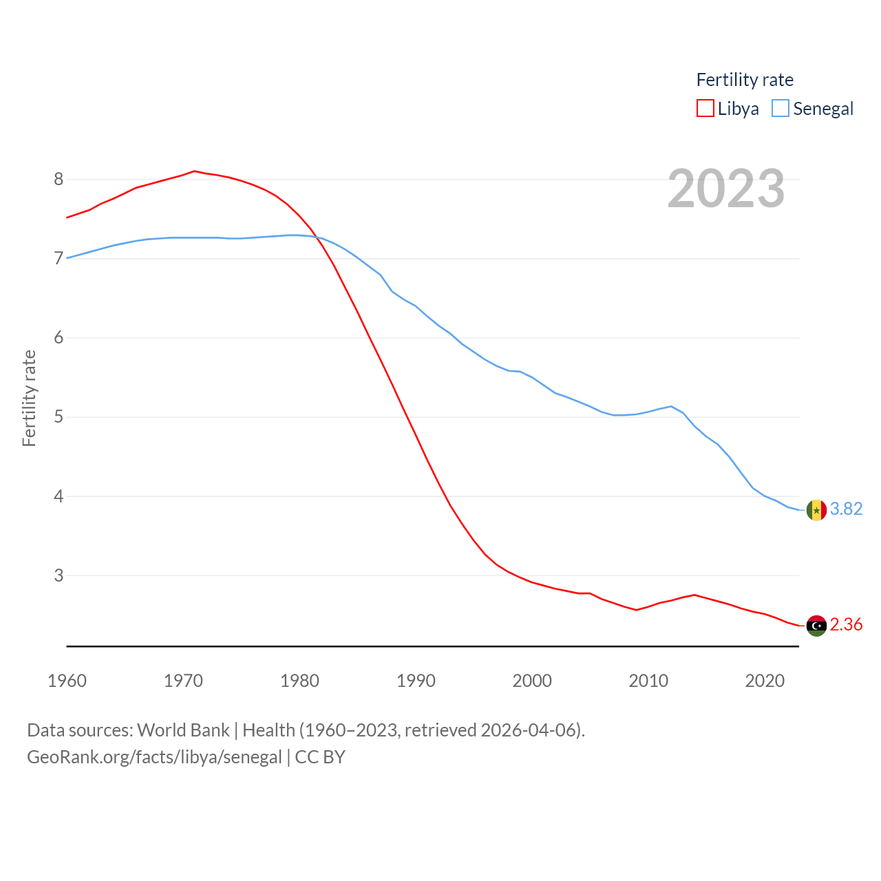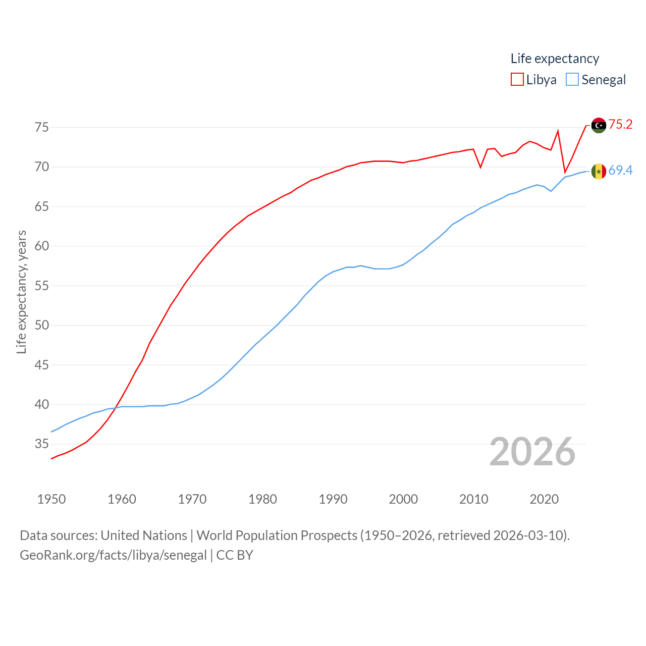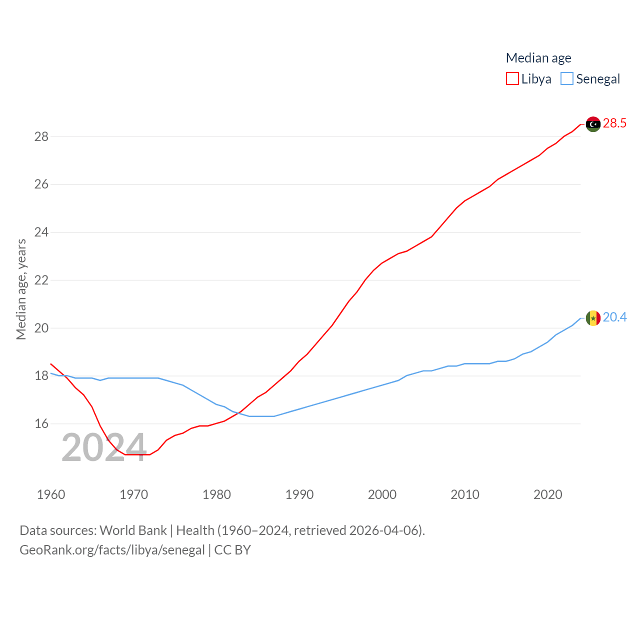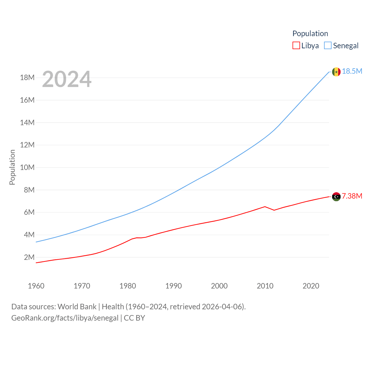 Libya has a population of 7.38M (ranked 105/197), compared with 18.5M in Senegal (ranked 69/197). Libya's land area is 679,362 sq mi versus 74,336 sq mi for Senegal (ranked 16th vs. 85th).