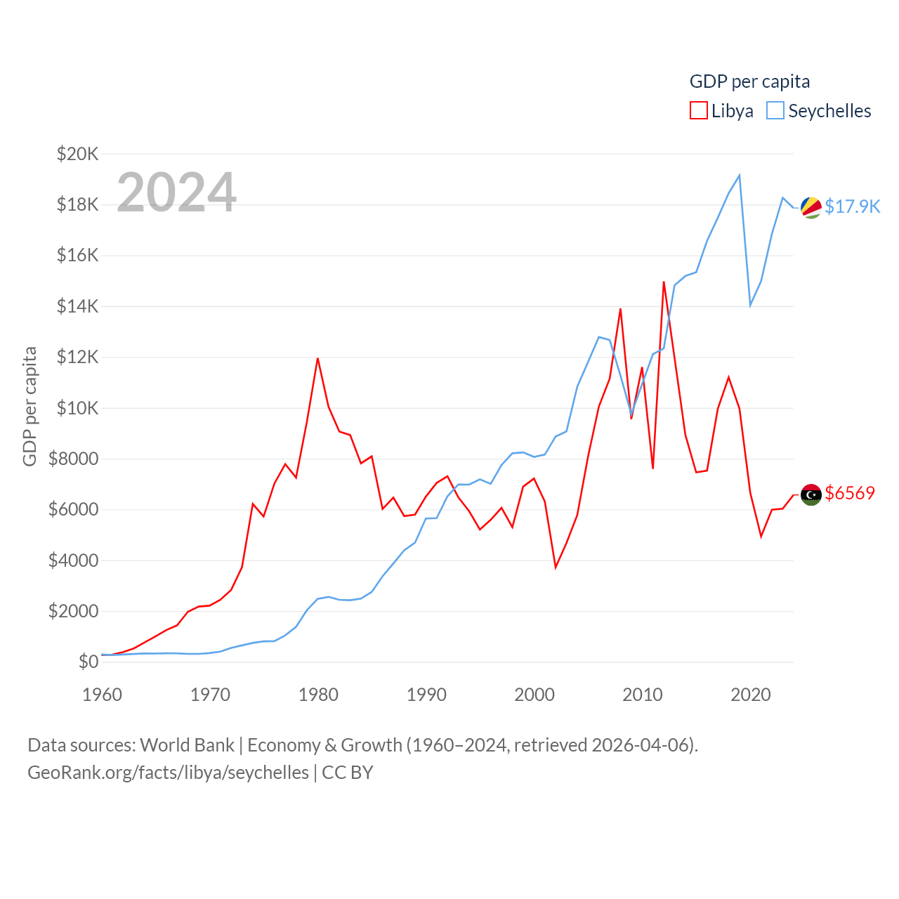 By GDP, Libya ranks 95/197 ($48.5B) and The Seychelles ranks 178/197 ($2.17B). By GDP per capita, Libya ranks 107/197 ($6,569), while The Seychelles ranks 63/197 ($17,859).