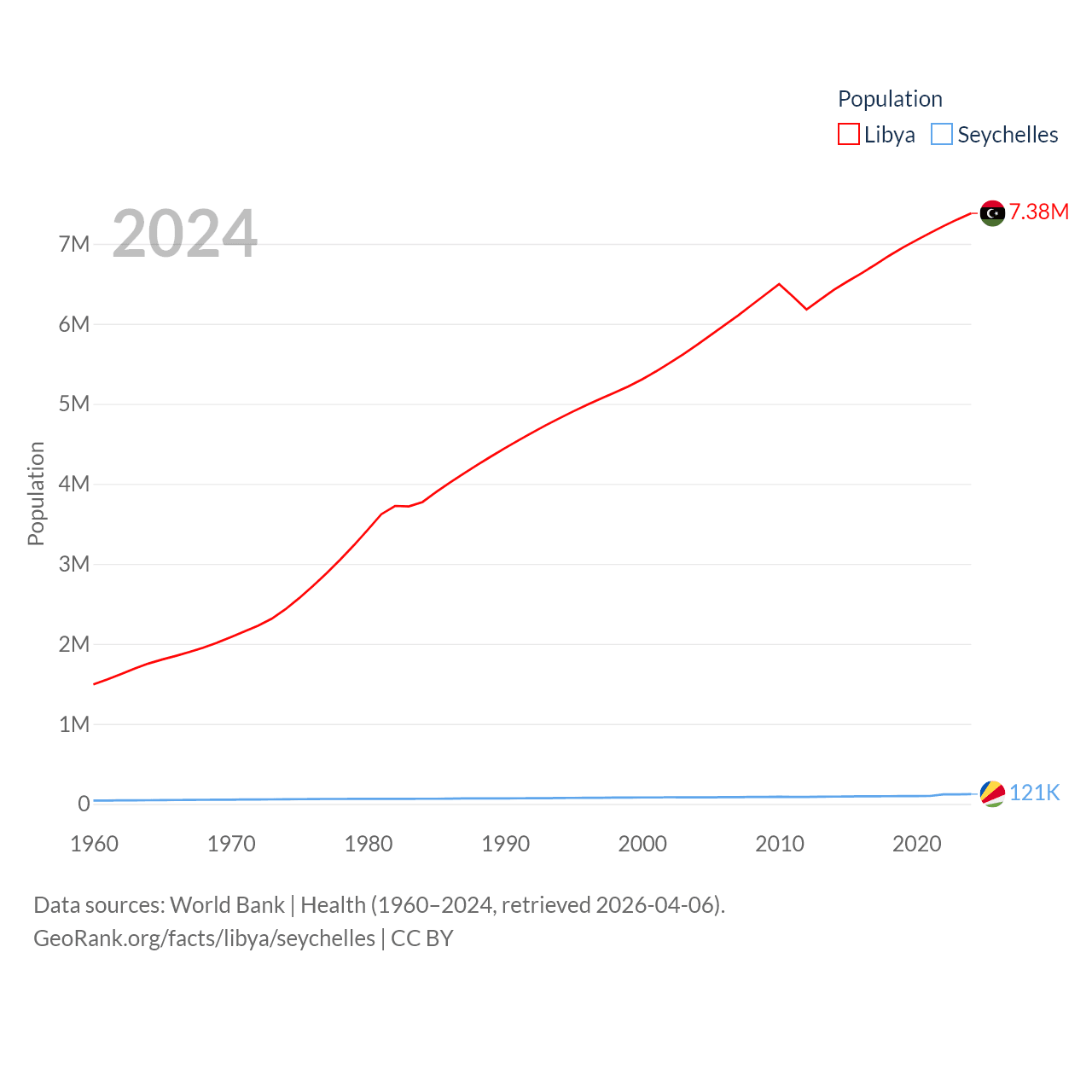 Libya has a population of 7.38M (ranked 105/197), compared with 121K in The Seychelles (ranked 181/197). Libya's land area is 679,362 sq mi versus 177.6 sq mi for The Seychelles (ranked 16th vs. 181st).