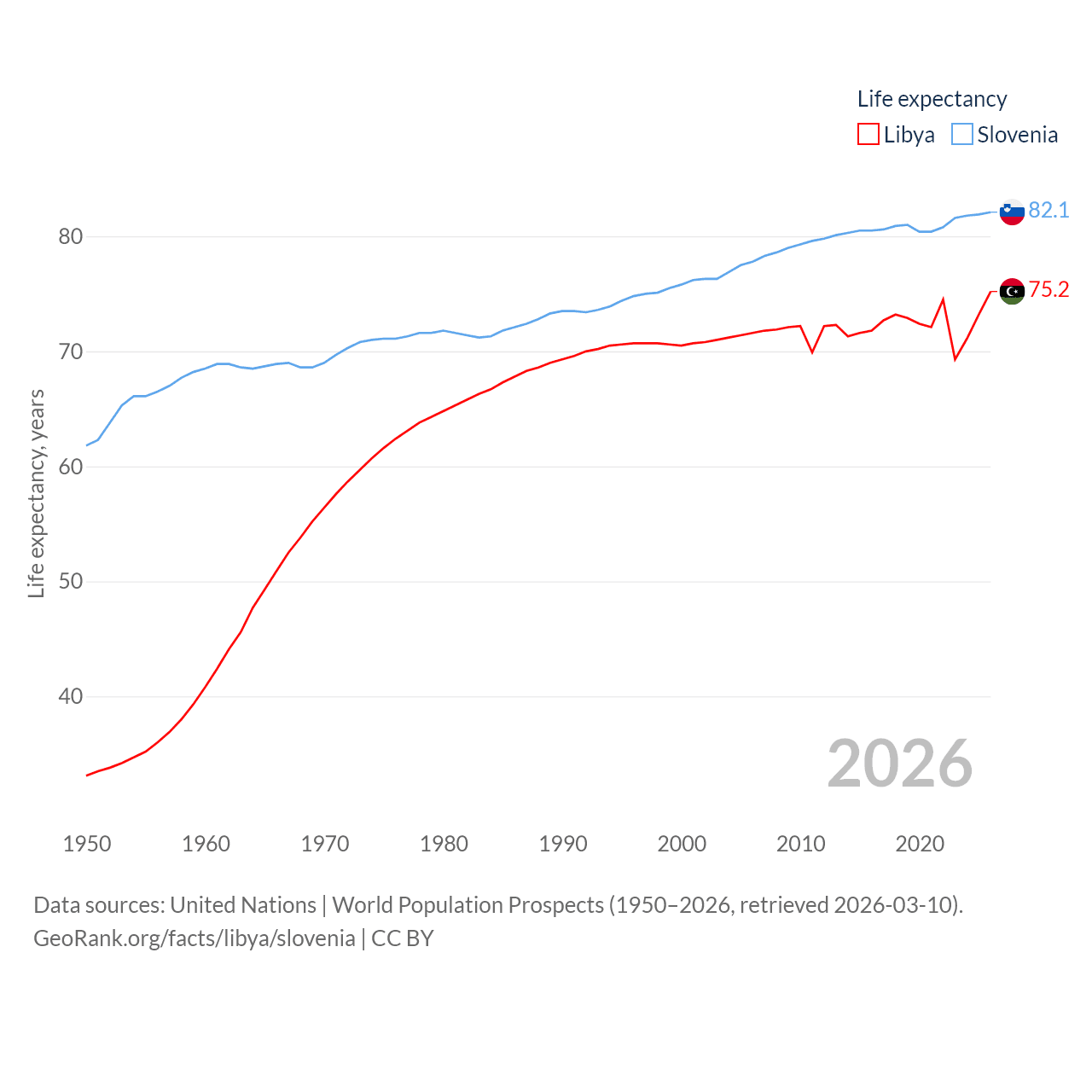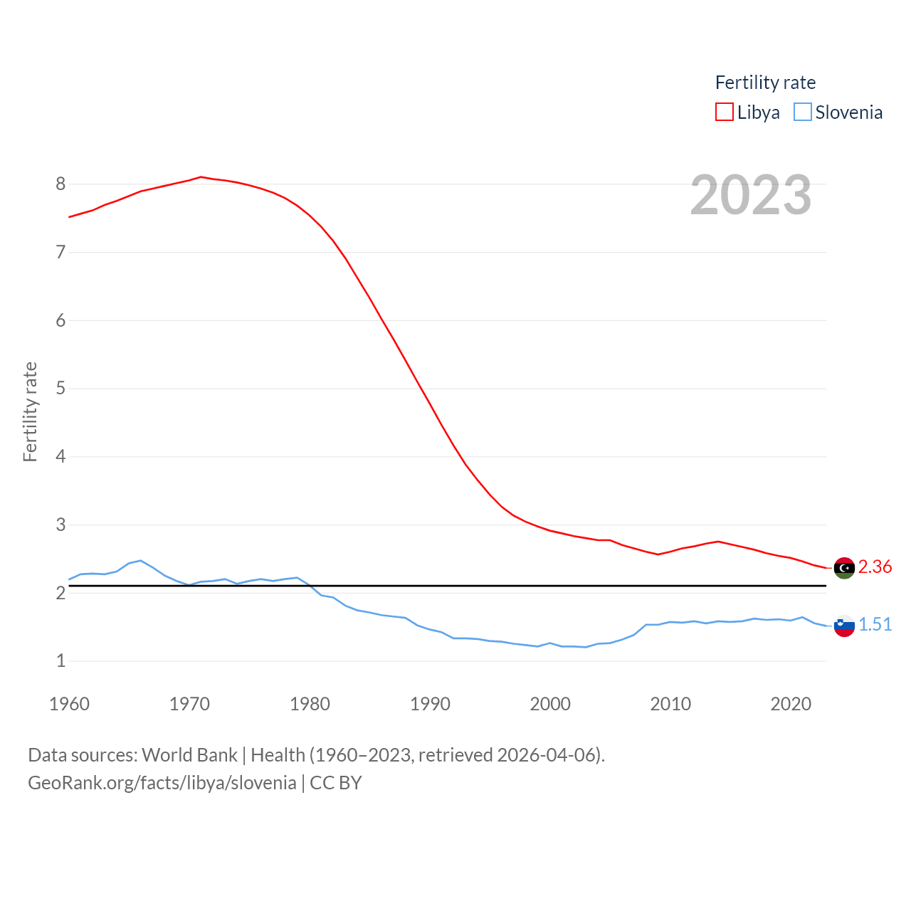Libya has a population of 7.38M (ranked 105/197), compared with 2.13M in Slovenia (ranked 147/197). Libya's land area is 679,362 sq mi versus 7,774 sq mi for Slovenia (ranked 16th vs. 151st).