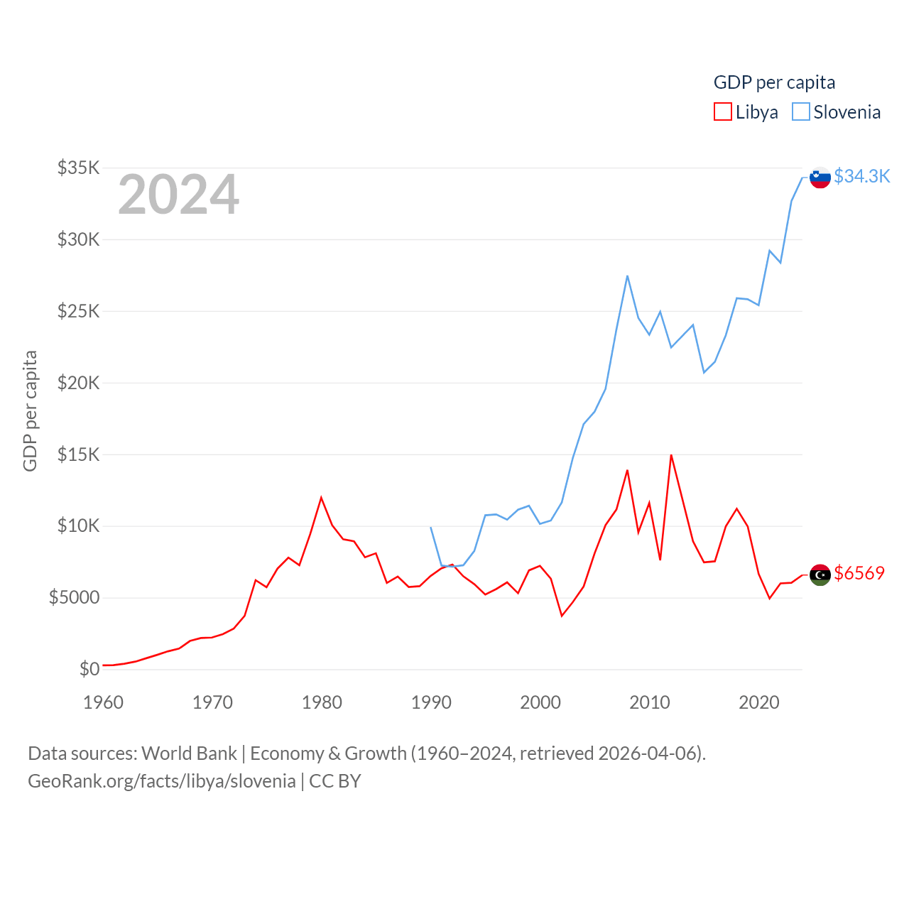 By GDP, Libya ranks 95/197 ($48.5B) and Slovenia ranks 86/197 ($73B). By GDP per capita, Libya ranks 107/197 ($6,569), while Slovenia ranks 34/197 ($34,301).