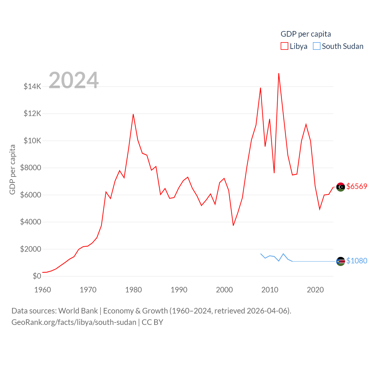 By GDP, Libya ranks 95/197 ($48.5B) and South Sudan ranks 149/197 ($12B). By GDP per capita, Libya ranks 107/197 ($6,569), while South Sudan ranks 175/197 ($1,080).