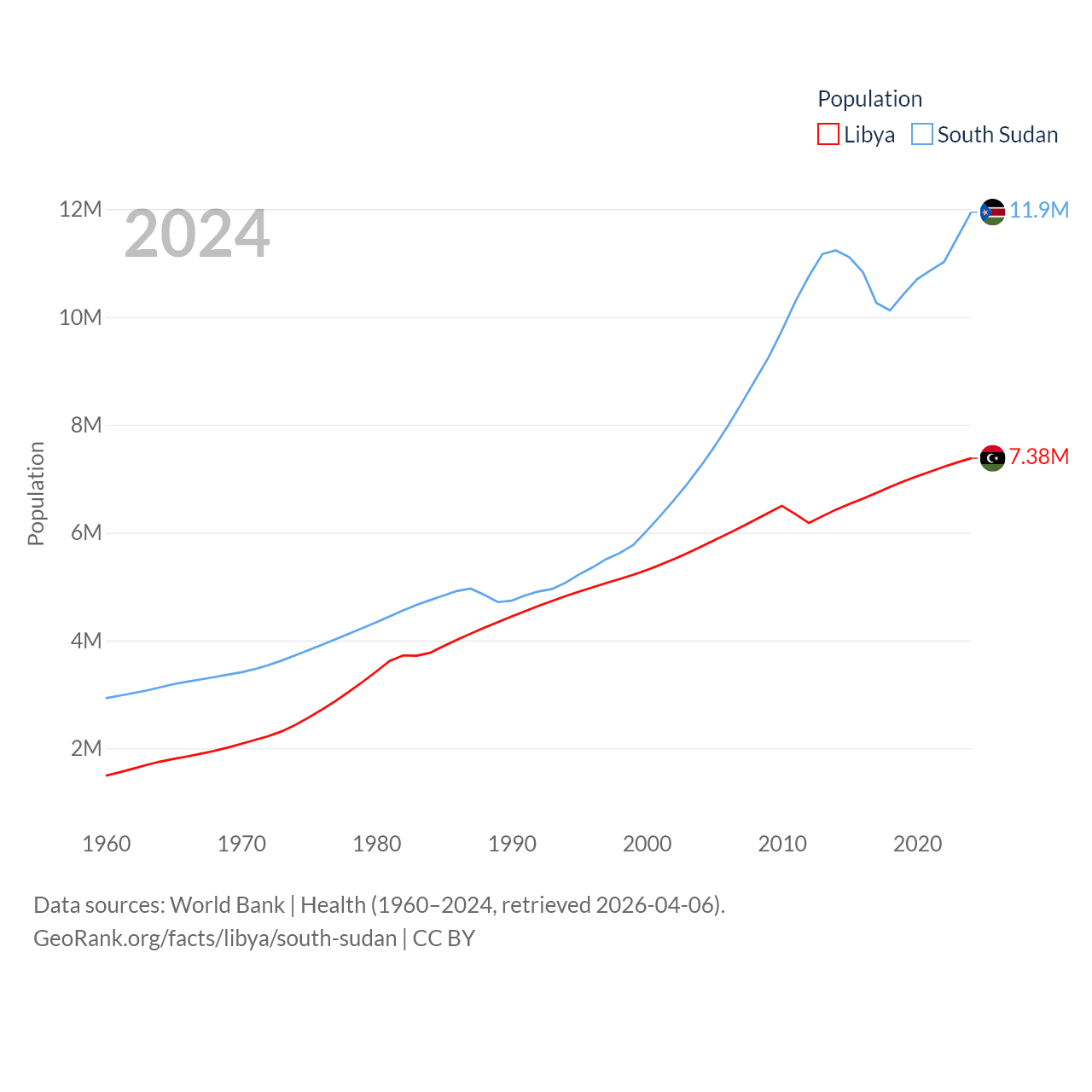 Libya has a population of 7.38M (ranked 105/197), compared with 11.9M in South Sudan (ranked 81/197). Libya's land area is 679,362 sq mi versus 243,990 sq mi for South Sudan (ranked 16th vs. 41st).
