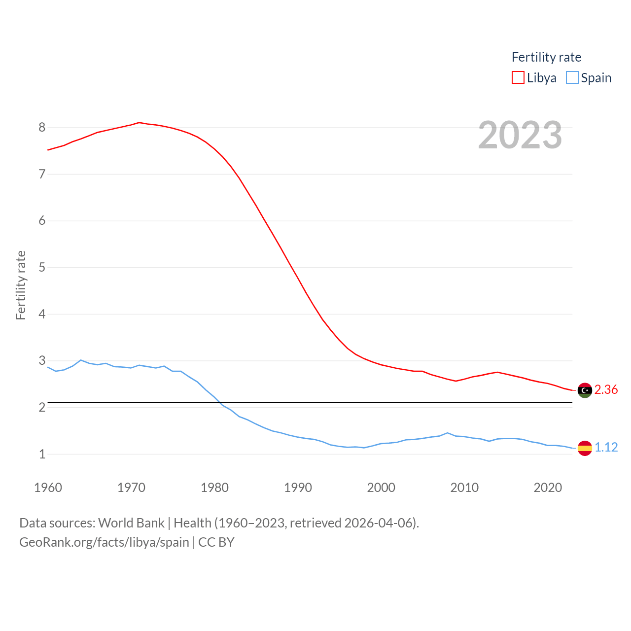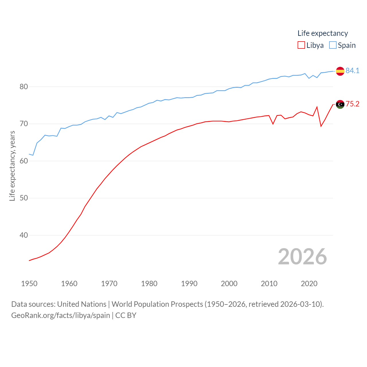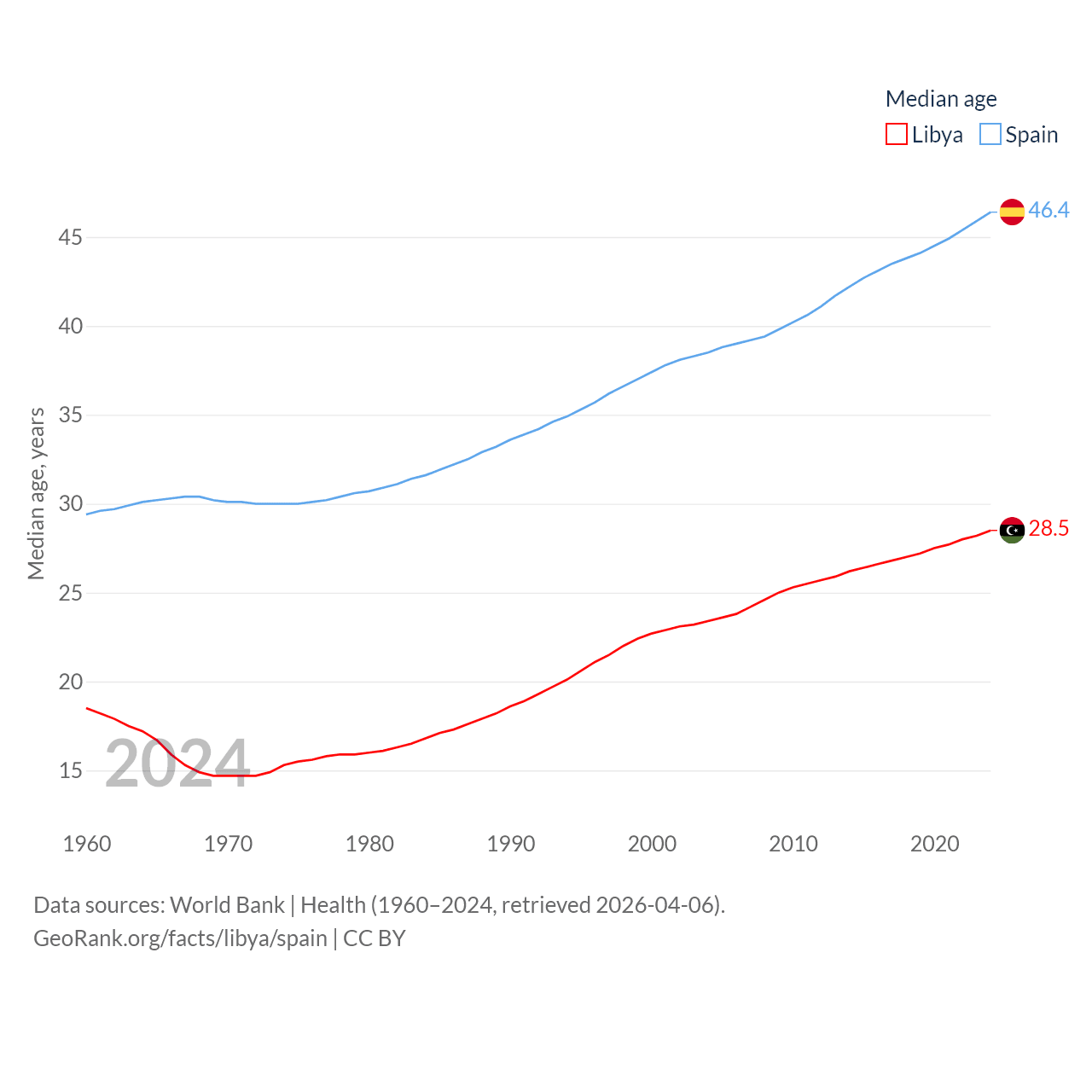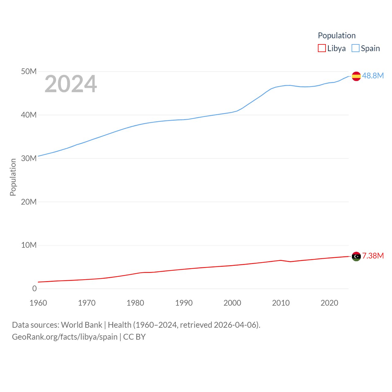 Libya has a population of 7.38M (ranked 105/197), compared with 48.8M in Spain (ranked 32/197). Libya's land area is 679,362 sq mi versus 192,934 sq mi for Spain (ranked 16th vs. 51st).
