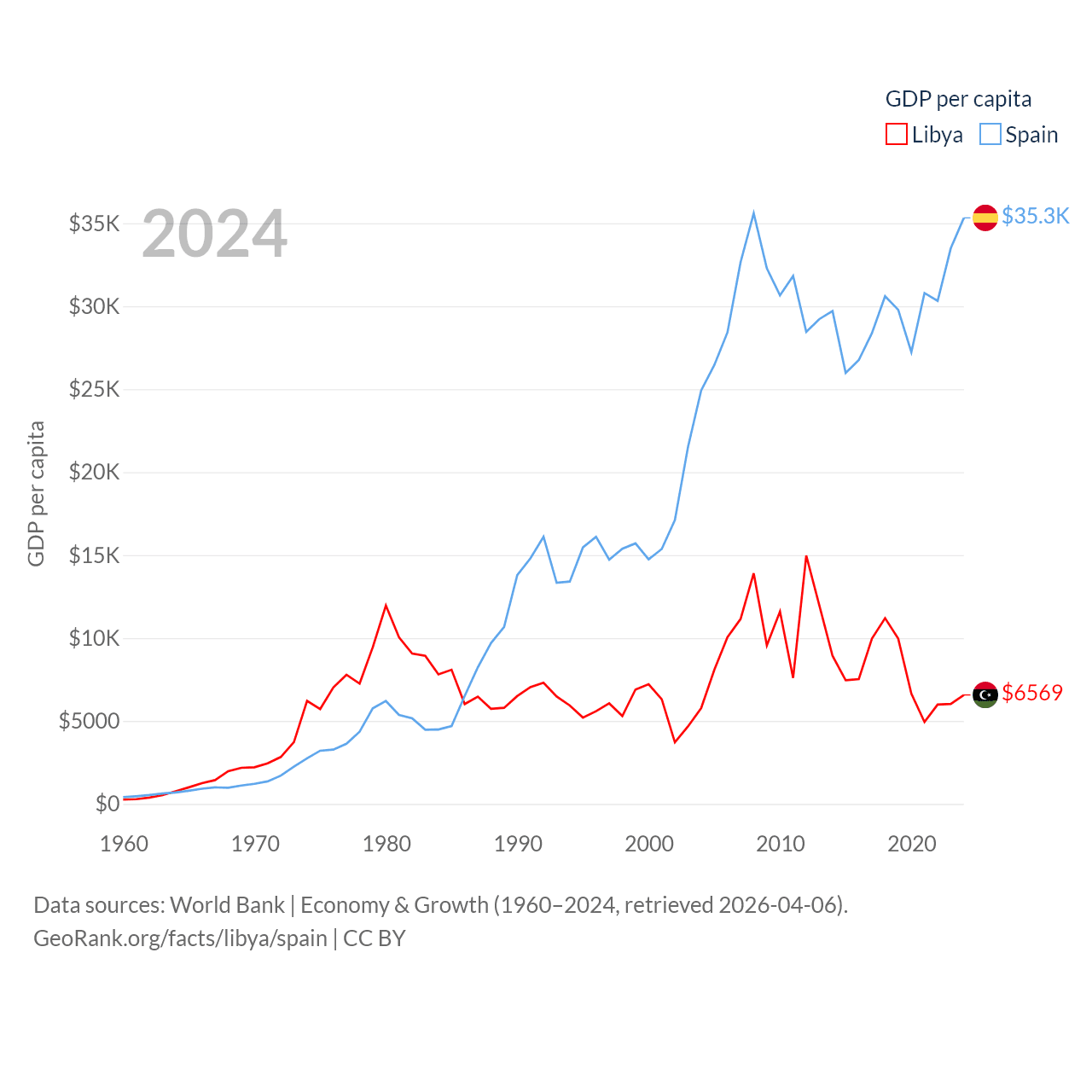 By GDP, Libya ranks 95/197 ($48.5B) and Spain ranks 15/197 ($1.73T). By GDP per capita, Libya ranks 107/197 ($6,569), while Spain ranks 32/197 ($35,327).