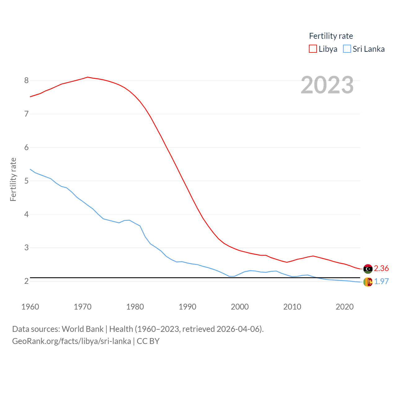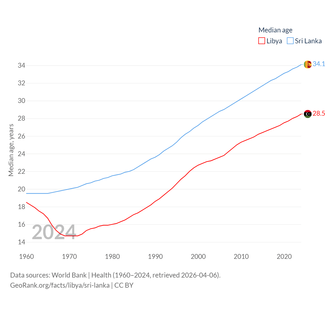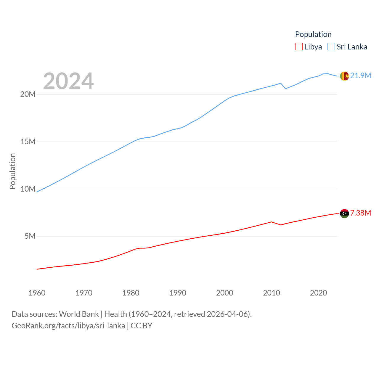 Libya has a population of 7.38M (ranked 105/197), compared with 21.9M in Sri Lanka (ranked 61/197). Libya's land area is 679,362 sq mi versus 23,884 sq mi for Sri Lanka (ranked 16th vs. 122nd).