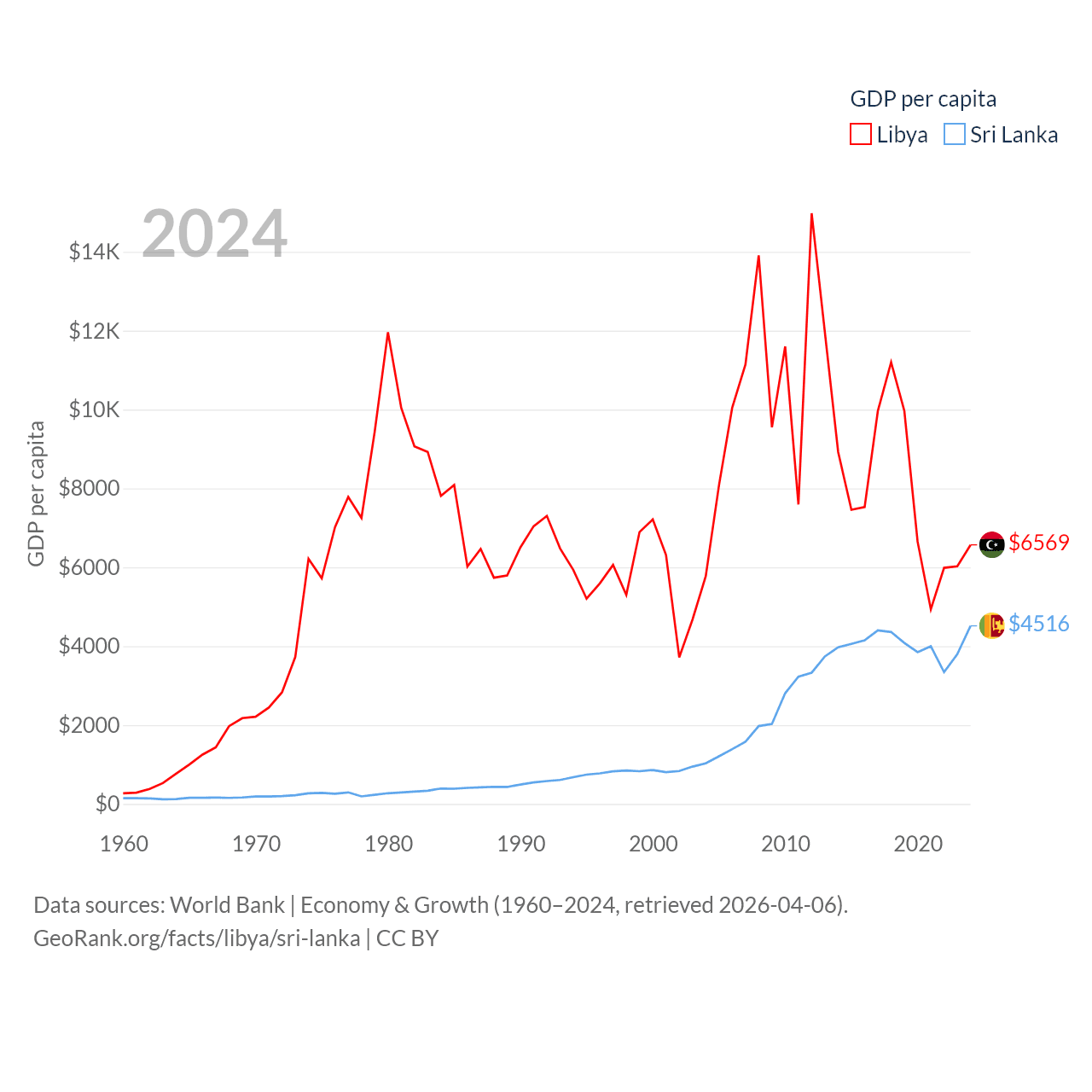 By GDP, Libya ranks 95/197 ($48.5B) and Sri Lanka ranks 72/197 ($99B). By GDP per capita, Libya ranks 107/197 ($6,569), while Sri Lanka ranks 124/197 ($4,516).