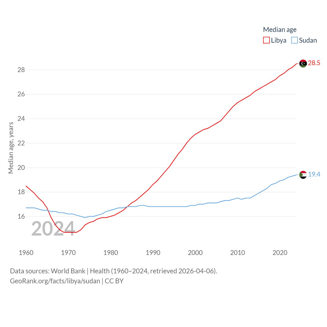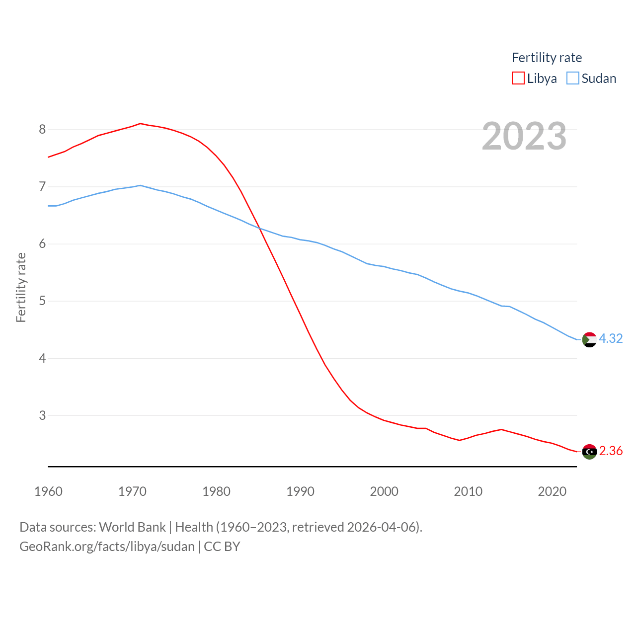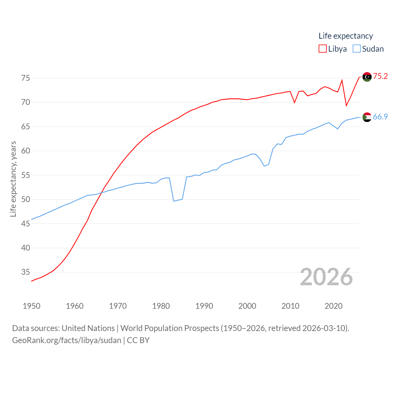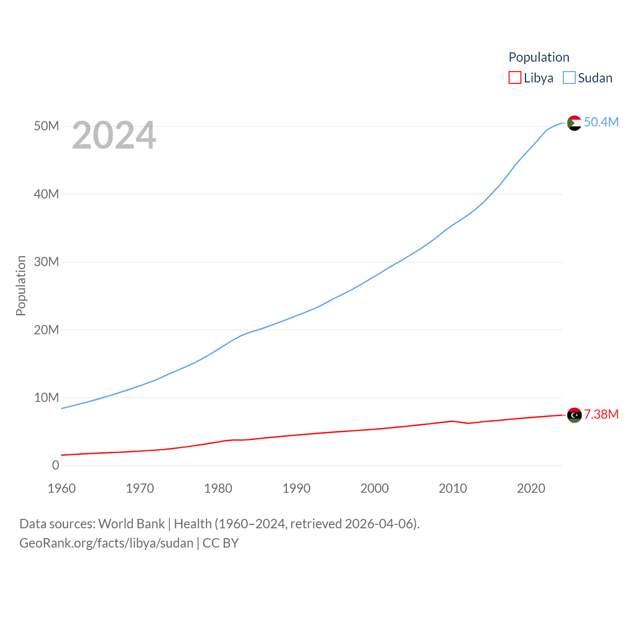 Libya has a population of 7.38M (ranked 105/197), compared with 50.4M in Sudan (ranked 30/197). Libya's land area is 679,362 sq mi versus 721,239 sq mi for Sudan (ranked 16th vs. 15th).