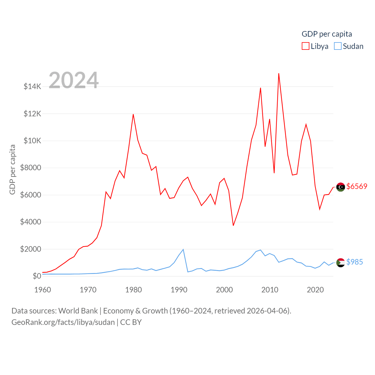By GDP, Libya ranks 95/197 ($48.5B) and Sudan ranks 94/197 ($49.7B). By GDP per capita, Libya ranks 107/197 ($6,569), while Sudan ranks 179/197 ($985).
