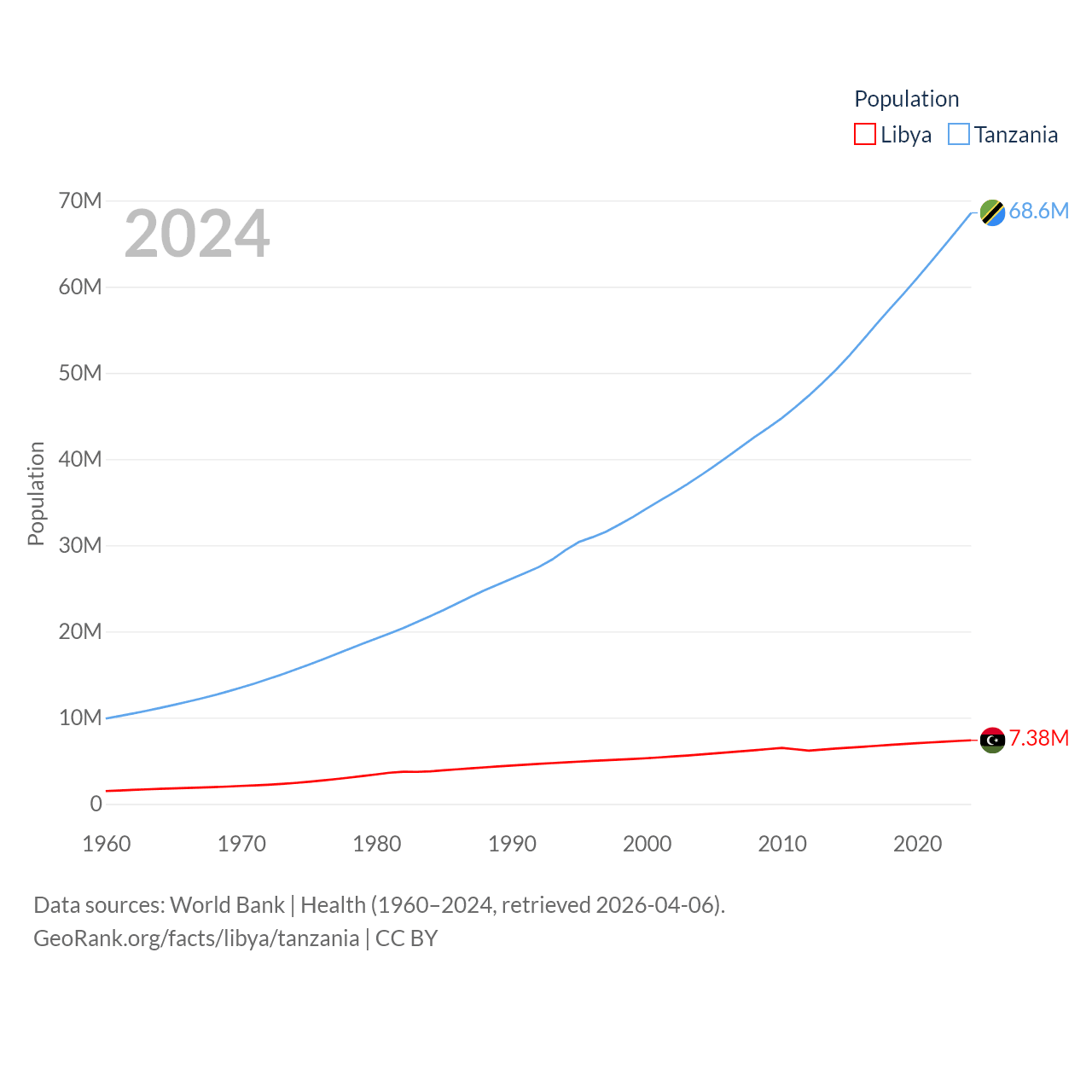 Libya has a population of 7.38M (ranked 105/197), compared with 68.6M in Tanzania (ranked 22/197). Libya's land area is 679,362 sq mi versus 342,009 sq mi for Tanzania (ranked 16th vs. 31st).