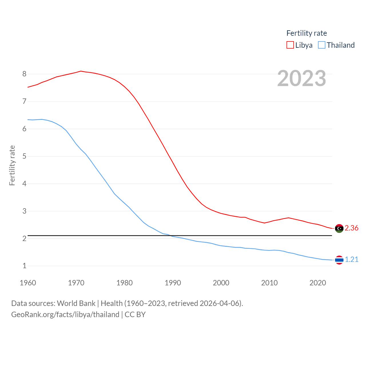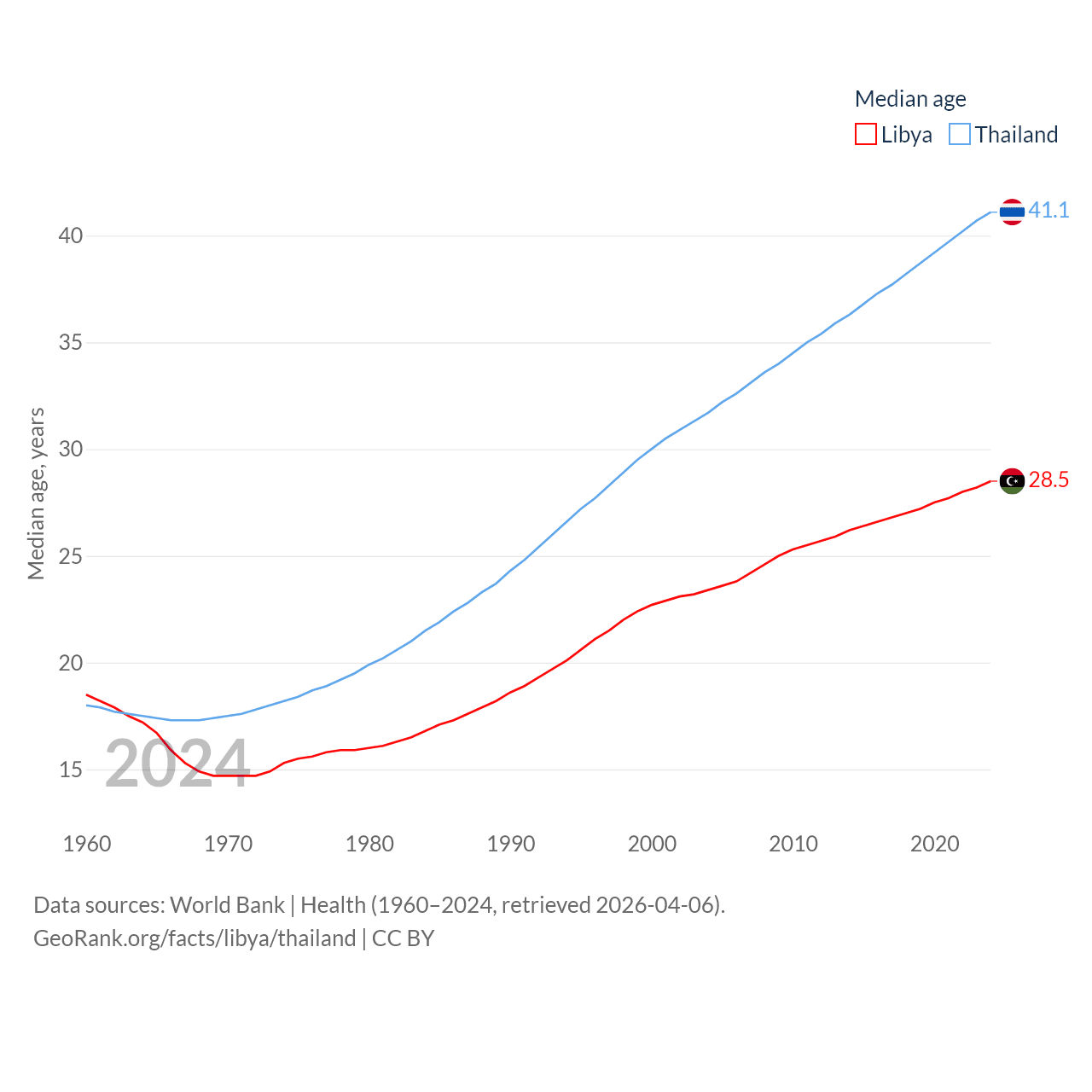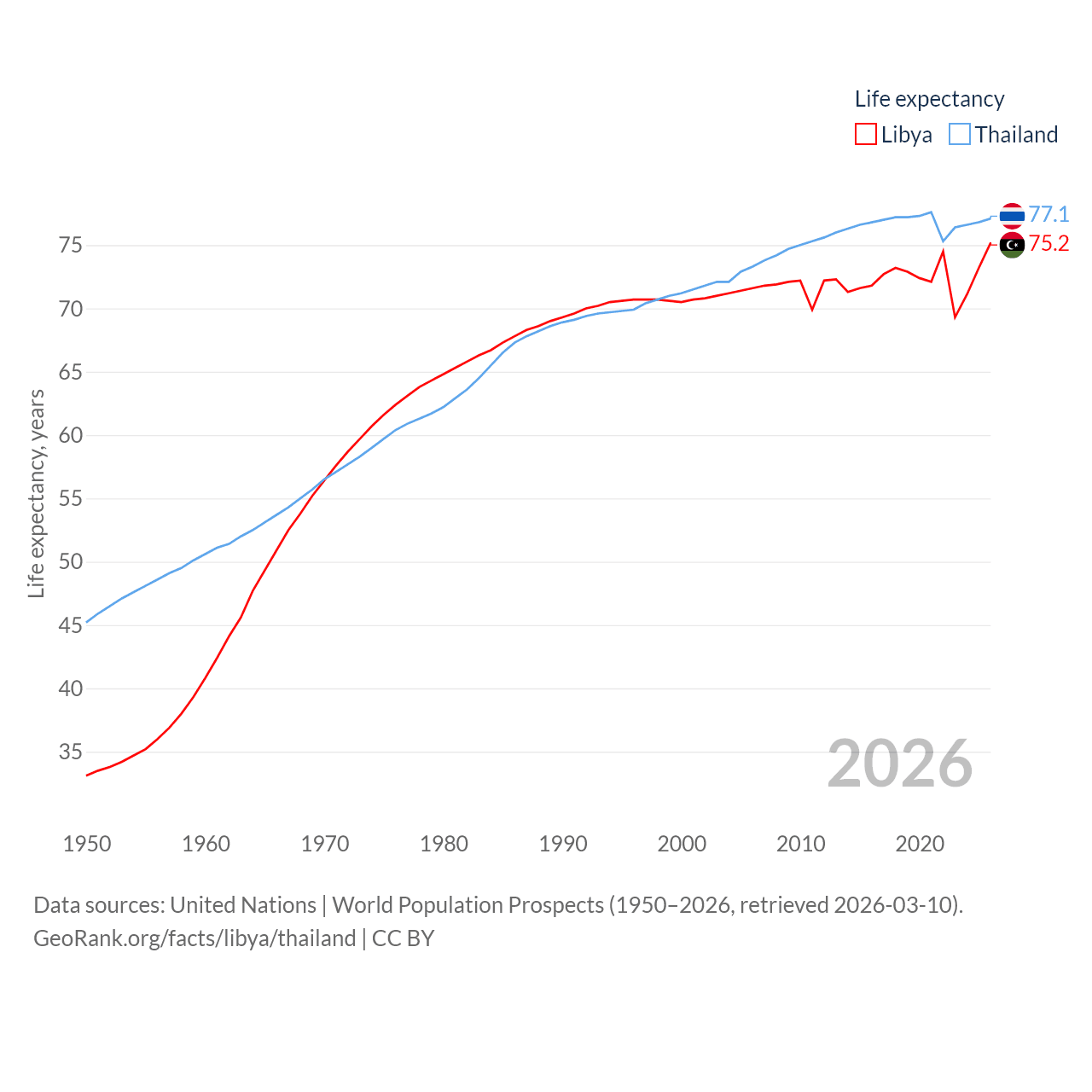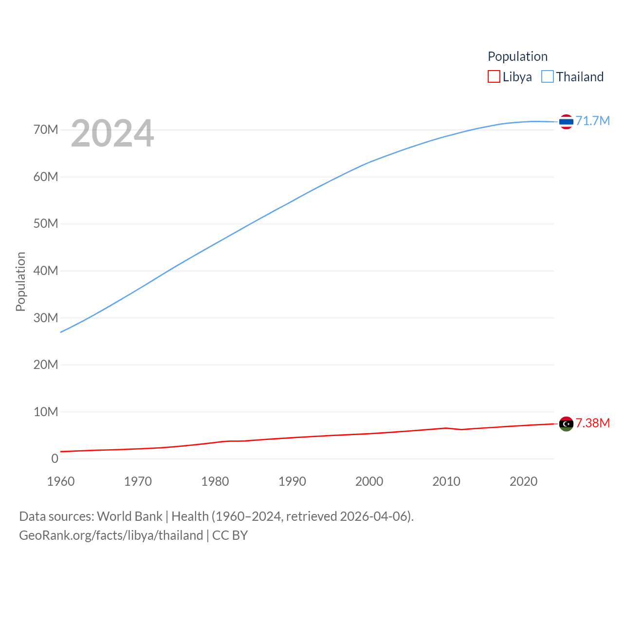 Libya has a population of 7.38M (ranked 105/197), compared with 71.7M in Thailand (ranked 20/197). Libya's land area is 679,362 sq mi versus 197,256 sq mi for Thailand (ranked 16th vs. 50th).