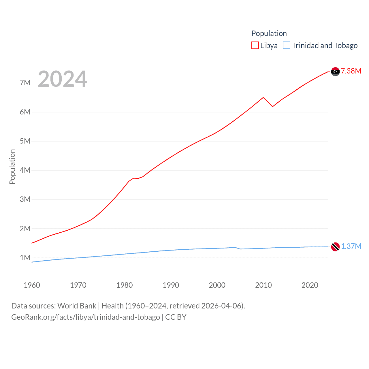 Libya has a population of 7.38M (ranked 105/197), compared with 1.37M in Trinidad and Tobago (ranked 154/197). Libya's land area is 679,362 sq mi versus 1,981 sq mi for Trinidad and Tobago (ranked 16th vs. 166th).