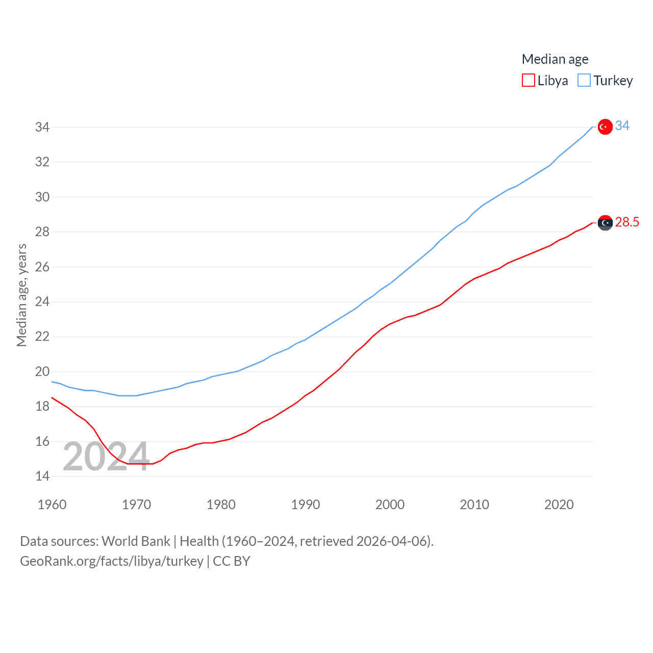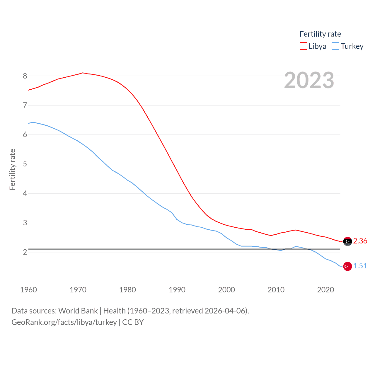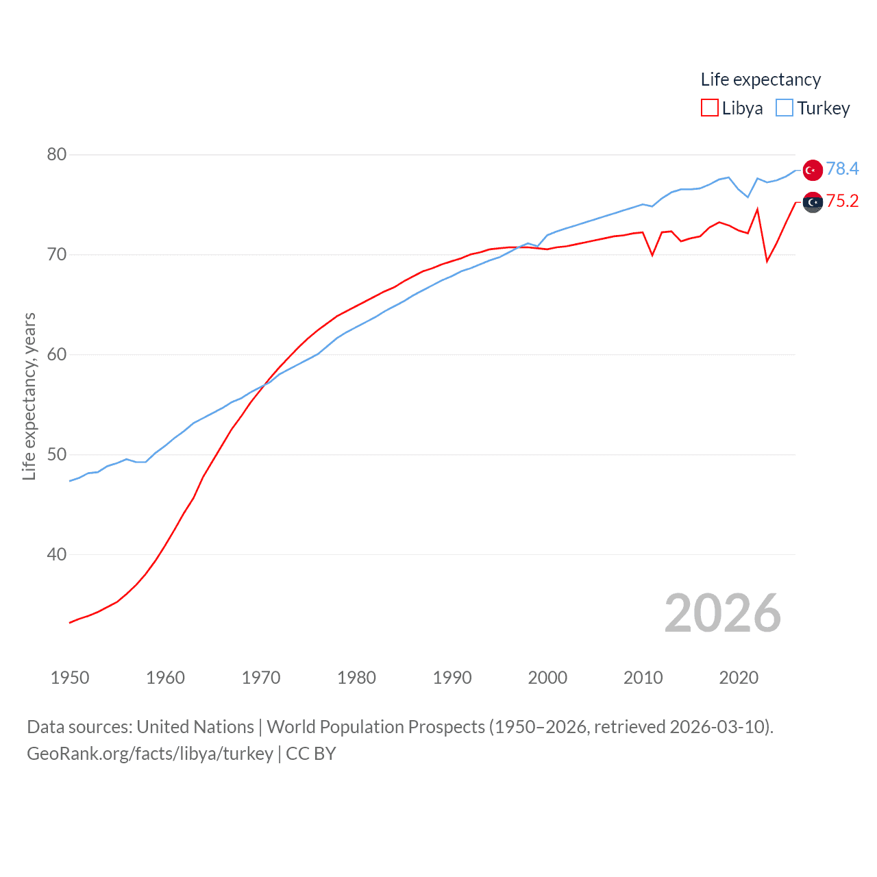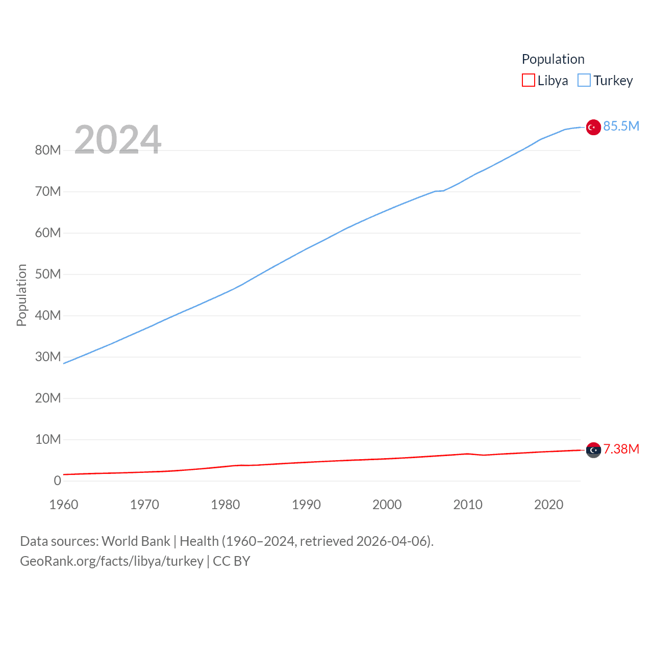 Libya has a population of 7.38M (ranked 105/197), compared with 85.5M in Turkey (ranked 18/197). Libya's land area is 679,362 sq mi versus 297,156 sq mi for Turkey (ranked 16th vs. 36th).