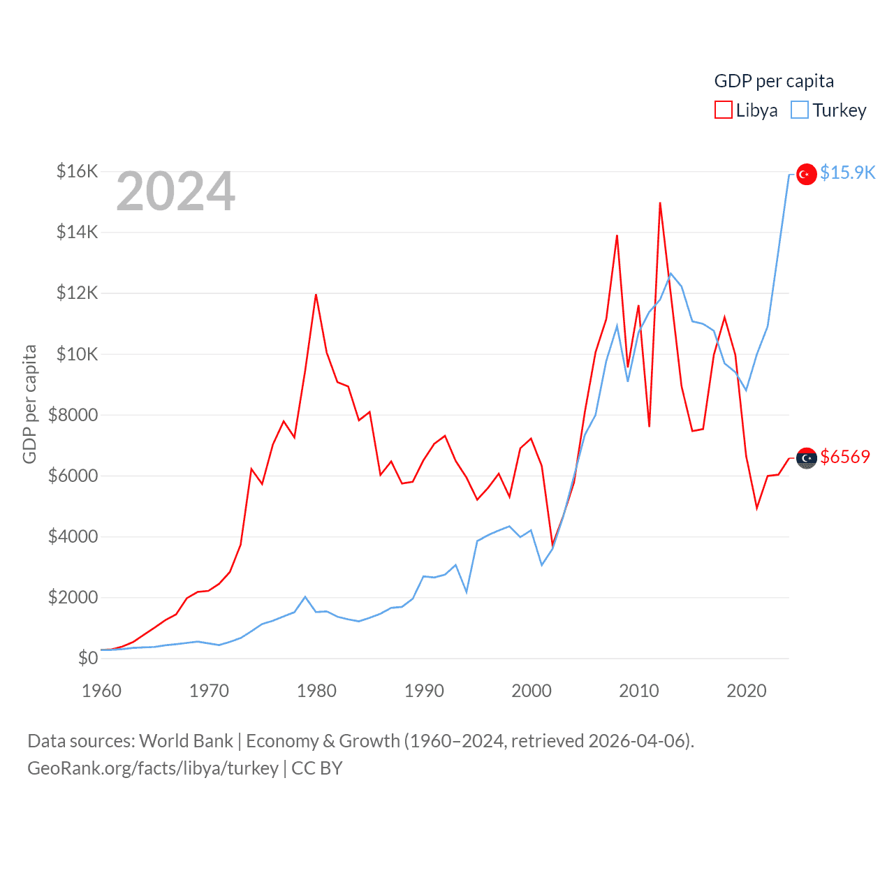 By GDP, Libya ranks 95/197 ($48.5B) and Turkey ranks 17/197 ($1.36T). By GDP per capita, Libya ranks 107/197 ($6,569), while Turkey ranks 66/197 ($15,893).