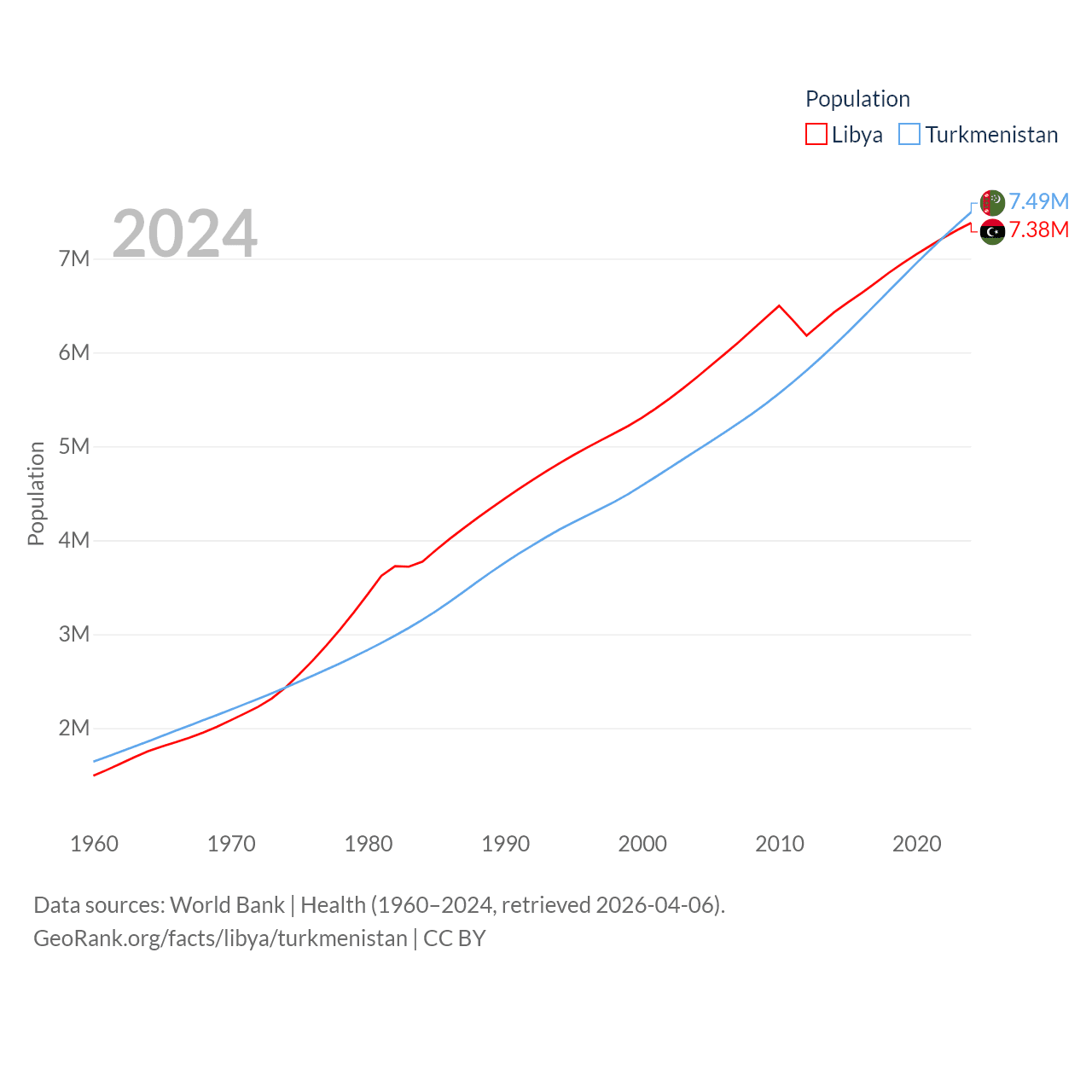 Libya has a population of 7.38M (ranked 105/197), compared with 7.49M in Turkmenistan (ranked 104/197). Libya's land area is 679,362 sq mi versus 181,441 sq mi for Turkmenistan (ranked 16th vs. 53rd).